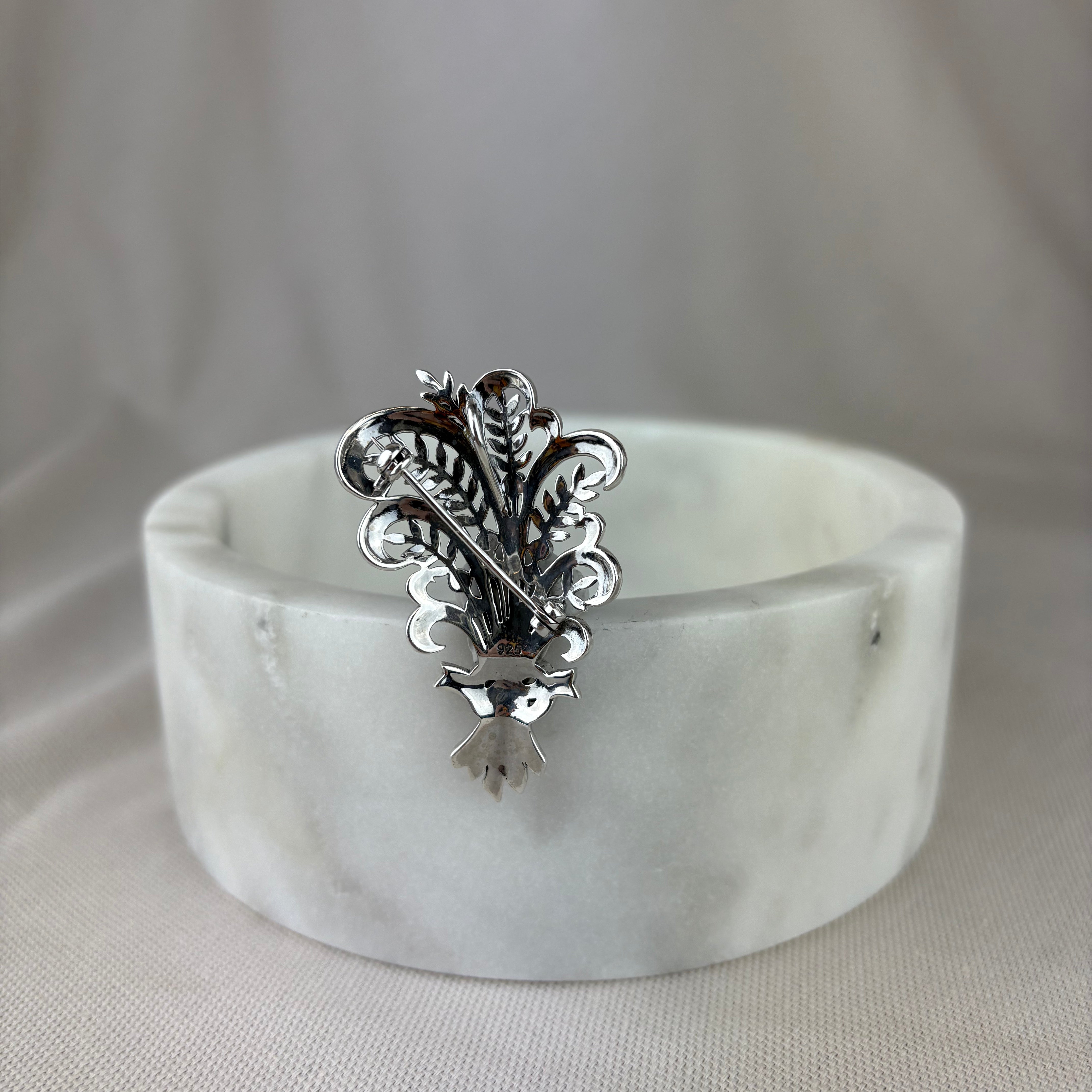 Vintage Design Sterling Silver Marcasite Pretty Peacock Brooch