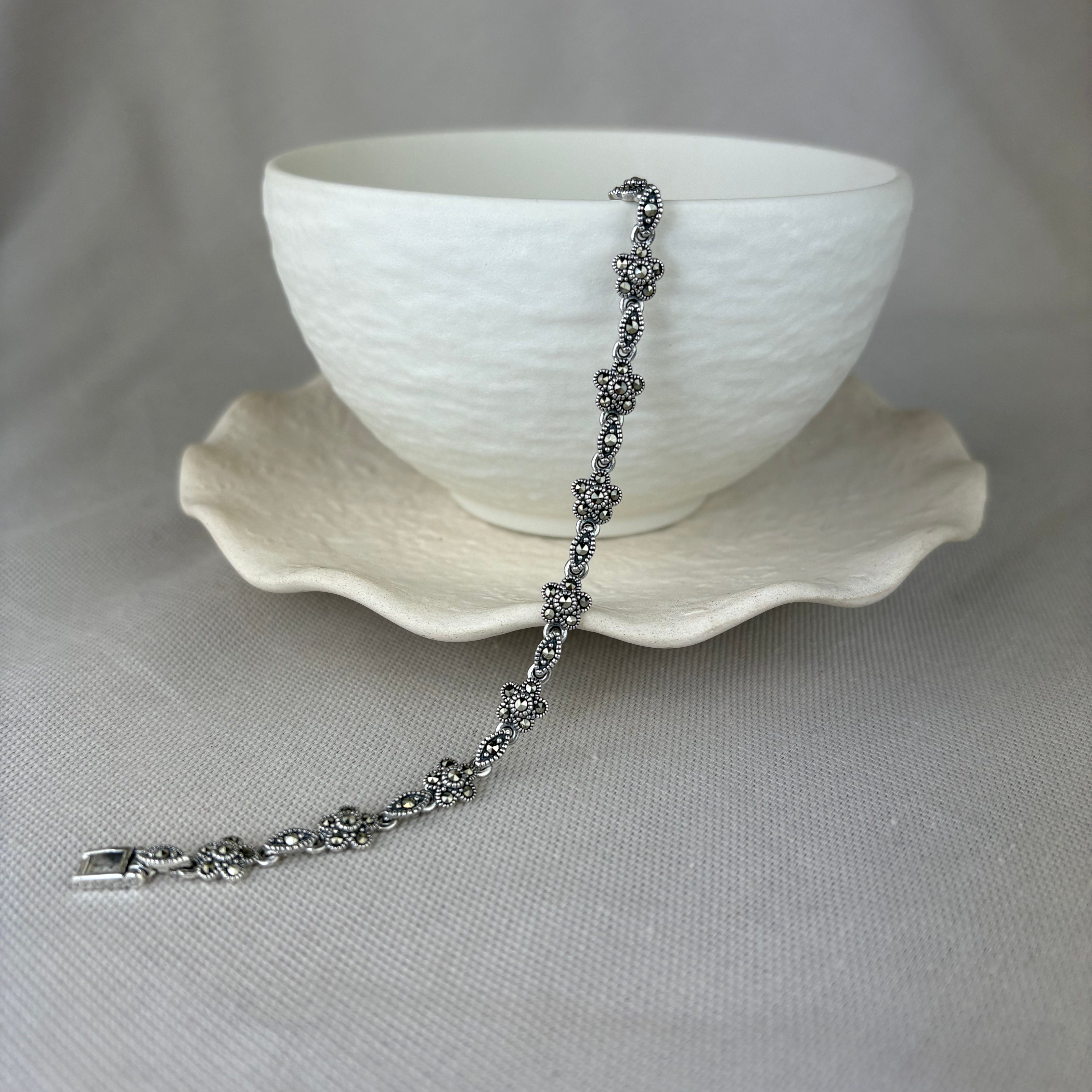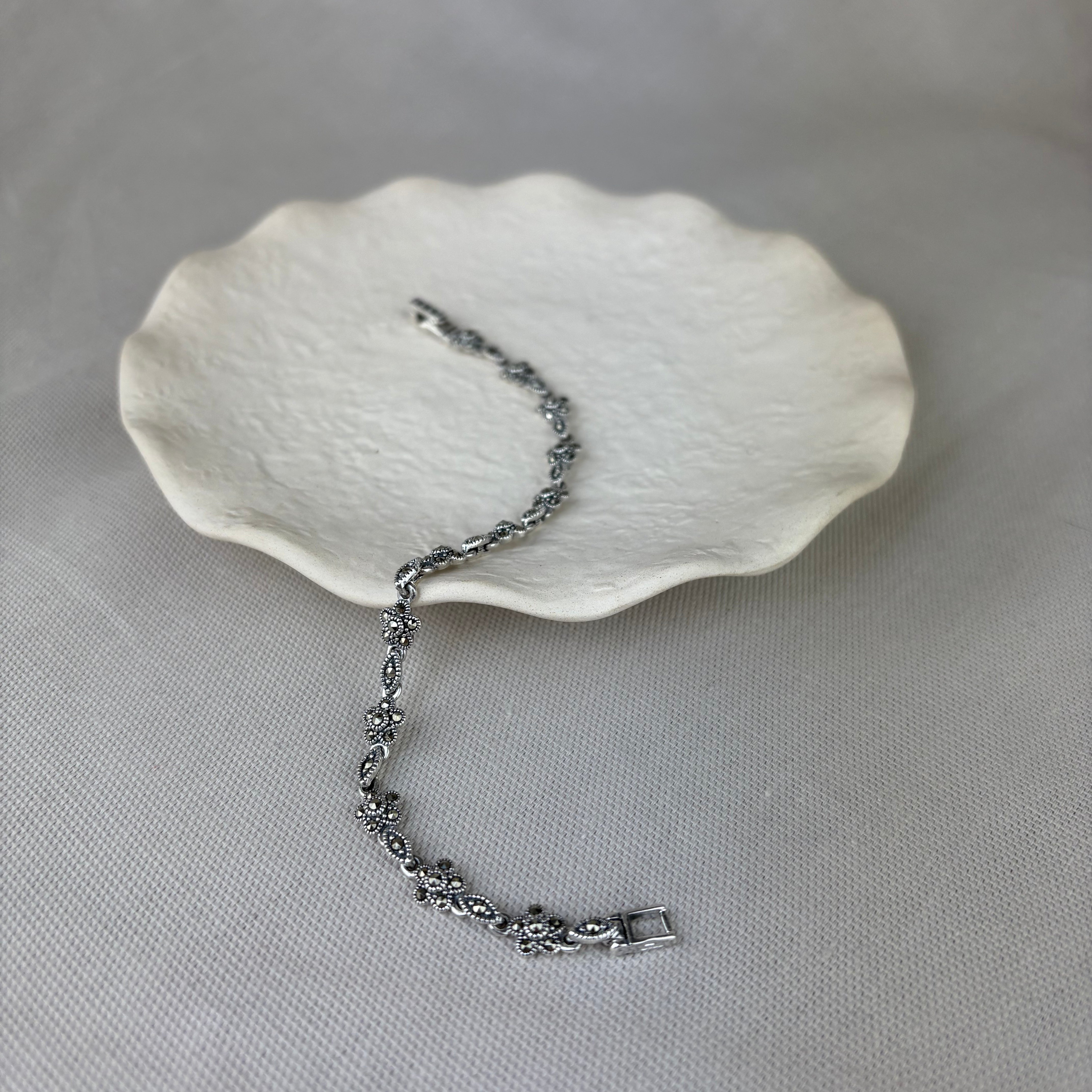 Vintage Design Sterling Silver Marcasite Flower Link Bracelet
