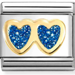 Composable Classic size charm in stainless steel with 18ct yellow gold blue glitter enamel Double Heart symbol.