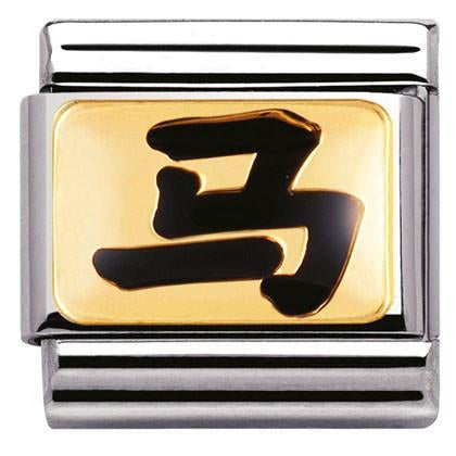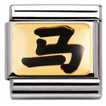 Composable Classic size charm in stainless steel with 18ct yellow gold black enamel Chinese Year of the Horse symbol.