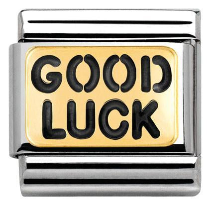 Composable Classic size charm in stainless steel with 18ct yellow gold black enamel GOOD LUCK message.