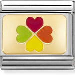 Composable Classic size charm in stainless steel with 18ct yellow gold rainbow enamel Four Leaf Clover symbol.