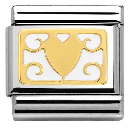 Nomination Composable Classic size charm in stainless steel with 18ct yellow gold white enamel Filigree Heart symbol.