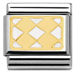 Nomination Composable Classic size charm in stainless steel with 18ct yellow gold white enamel Harlequin symbol.