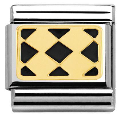 Nomination Composable Classic size charm in stainless steel with 18ct yellow gold black enamel Harlequin symbol.