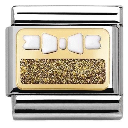 Nomination Composable Classic size charm in stainless steel with 18ct yellow gold white & gold glitter enamel Gift Bow symbol.