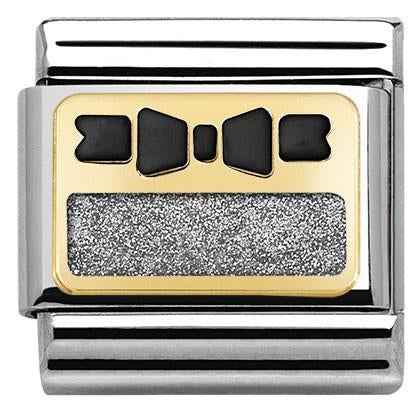 Nomination Composable Classic size charm in stainless steel with 18ct yellow gold black & silver glitter enamel Gift Bow symbol.