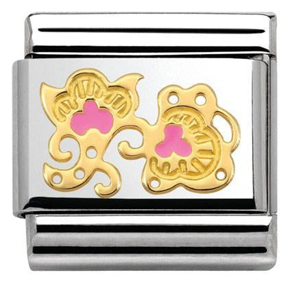 Nomination Composable Classic size charm in stainless steel with 18ct yellow gold pink enamel Paisley Flower Buds symbol.