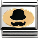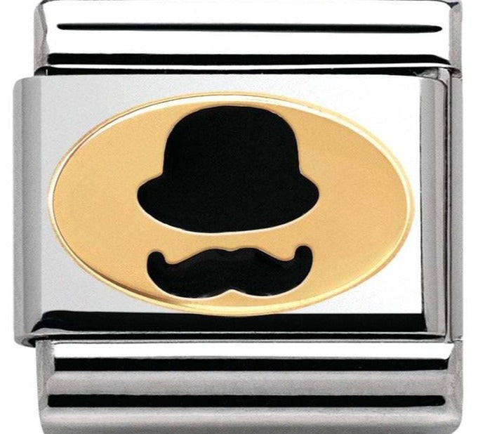 Composable Classic size charm in stainless steel with 18ct yellow gold black enamel Bowler Hat Moustache symbol.