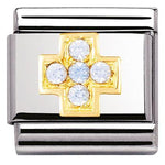 Composable Classic size charm in stainless steel with 18ct yellow gold baby blue cubic zirconia Cross symbol.
