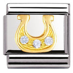 Composable Classic size charm in stainless steel with 18ct yellow gold baby blue cubic zirconia Horseshoe symbol.