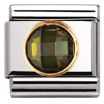 Composable Classic size charm in stainless steel with 18ct yellow gold Round Green Cubic Zirconia stone.