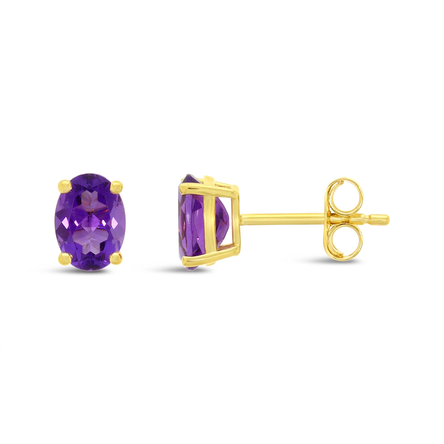 A beautifully simple pair of Amethyst stud earrings, featuring oval purple amethysts claw set in 9ct yellow gold finished with stem and butterfly fittings.