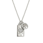 Sterling silver rhodium plated Talismani Love necklace, set with white cubic zirconia. Featuring heart shaped design with tree of life and rose quartz charm.