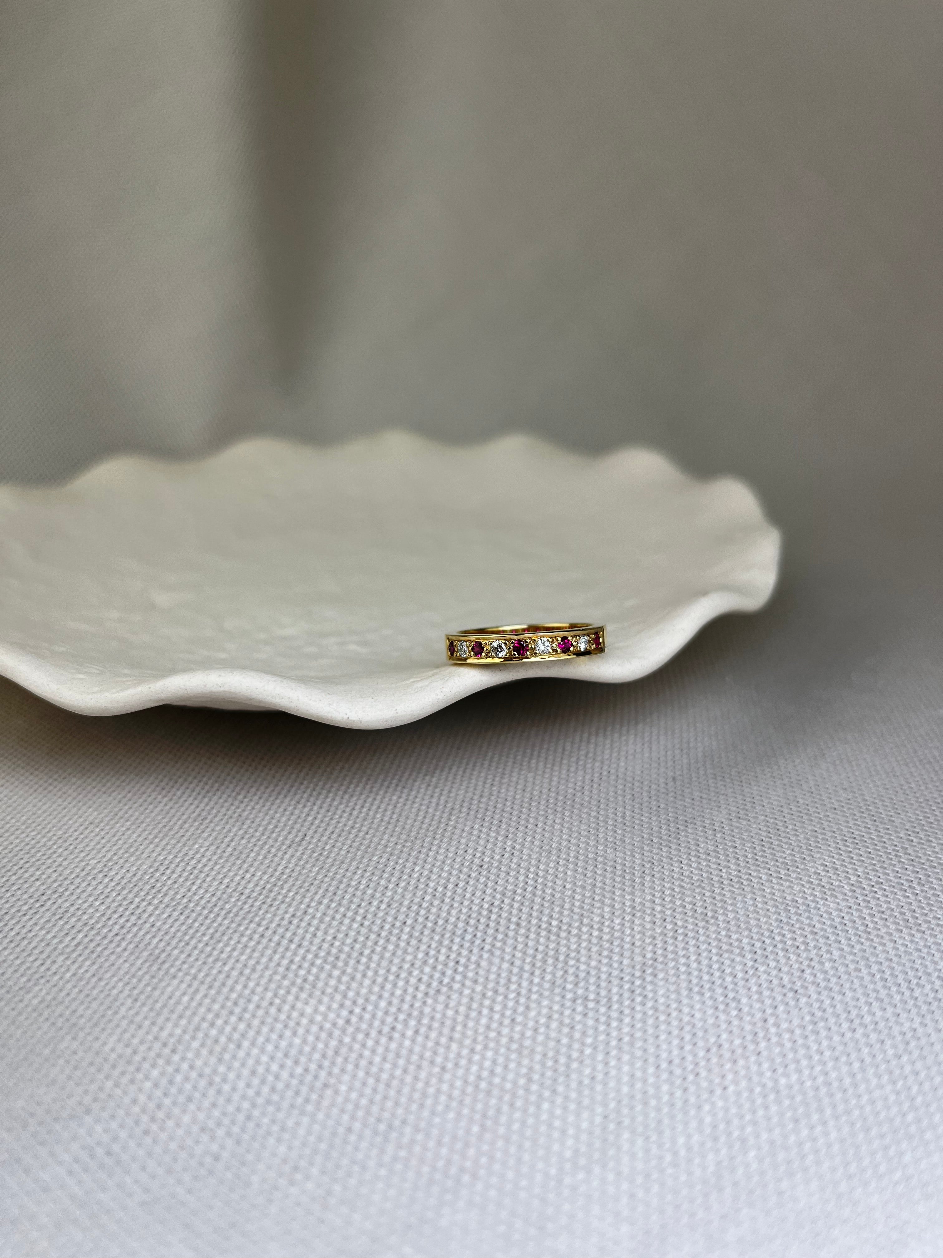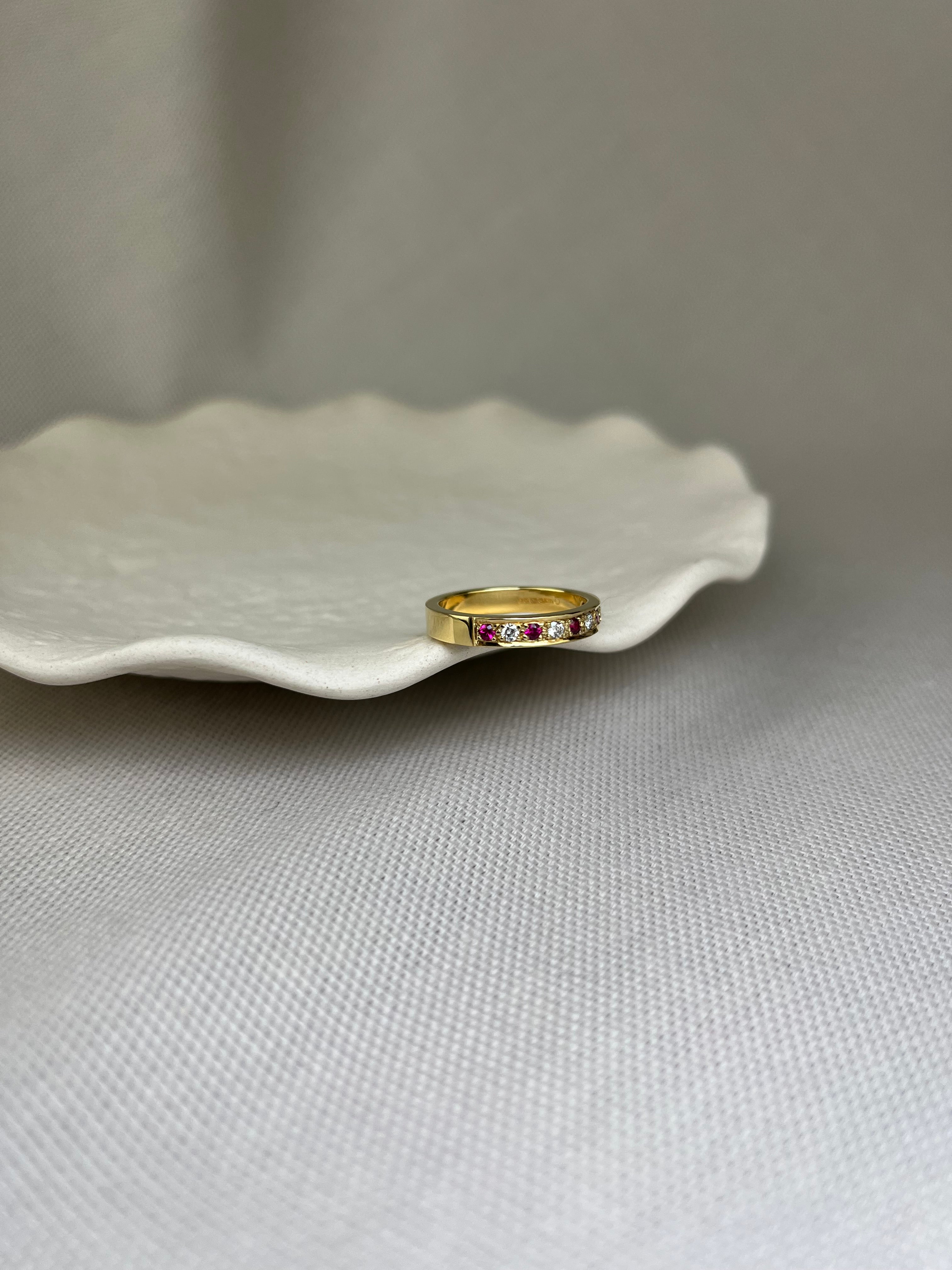 This pretty eternity ring combines the rich golden colour of 18ct yellow with the fiery red of rubies and the icy sparkle of diamonds: a truly fabulous combination!