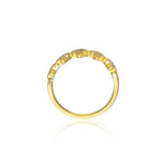 Made from 18ct yellow gold, the ring is grain set with four round brilliant cut diamonds in each section and completed by openwork shoulders and a delicate tapered 18ct yellow gold band.