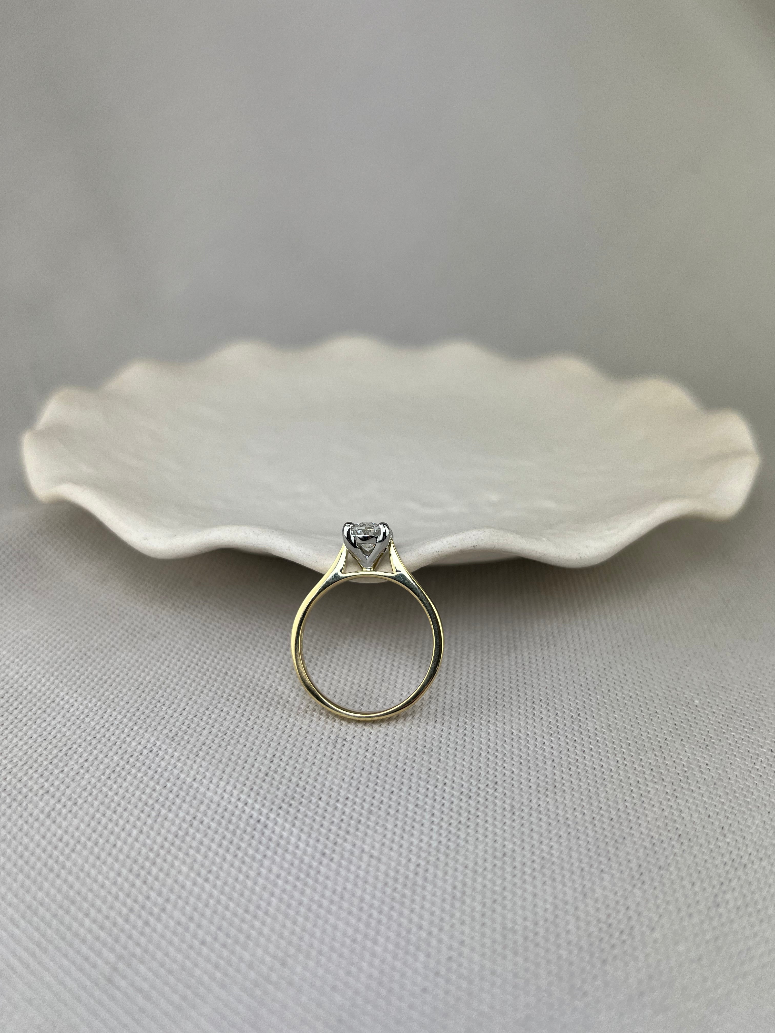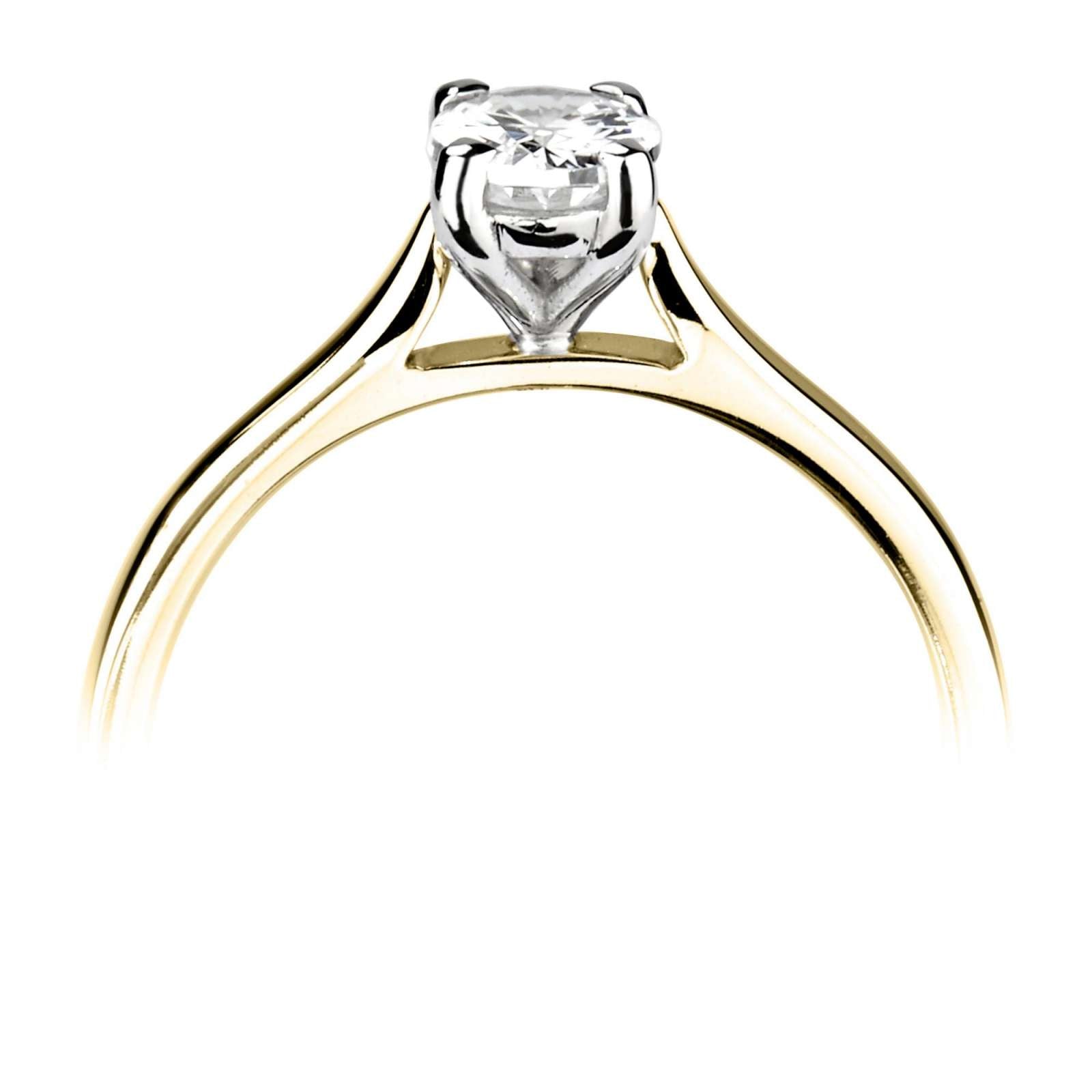 This solitaire diamond ring features an 18ct yellow gold tapered shoulder shank with V-shape four claw setting made from platinum.