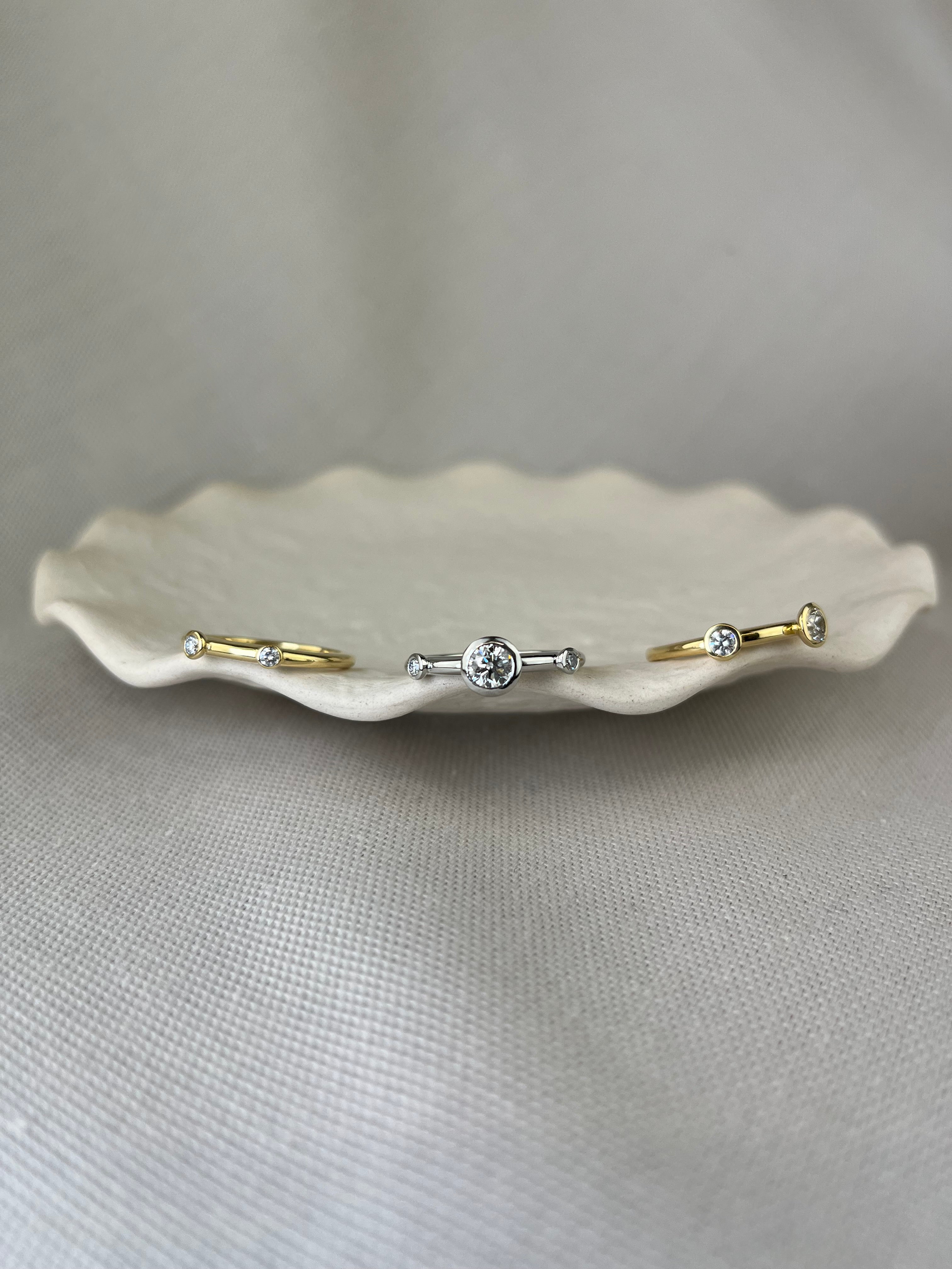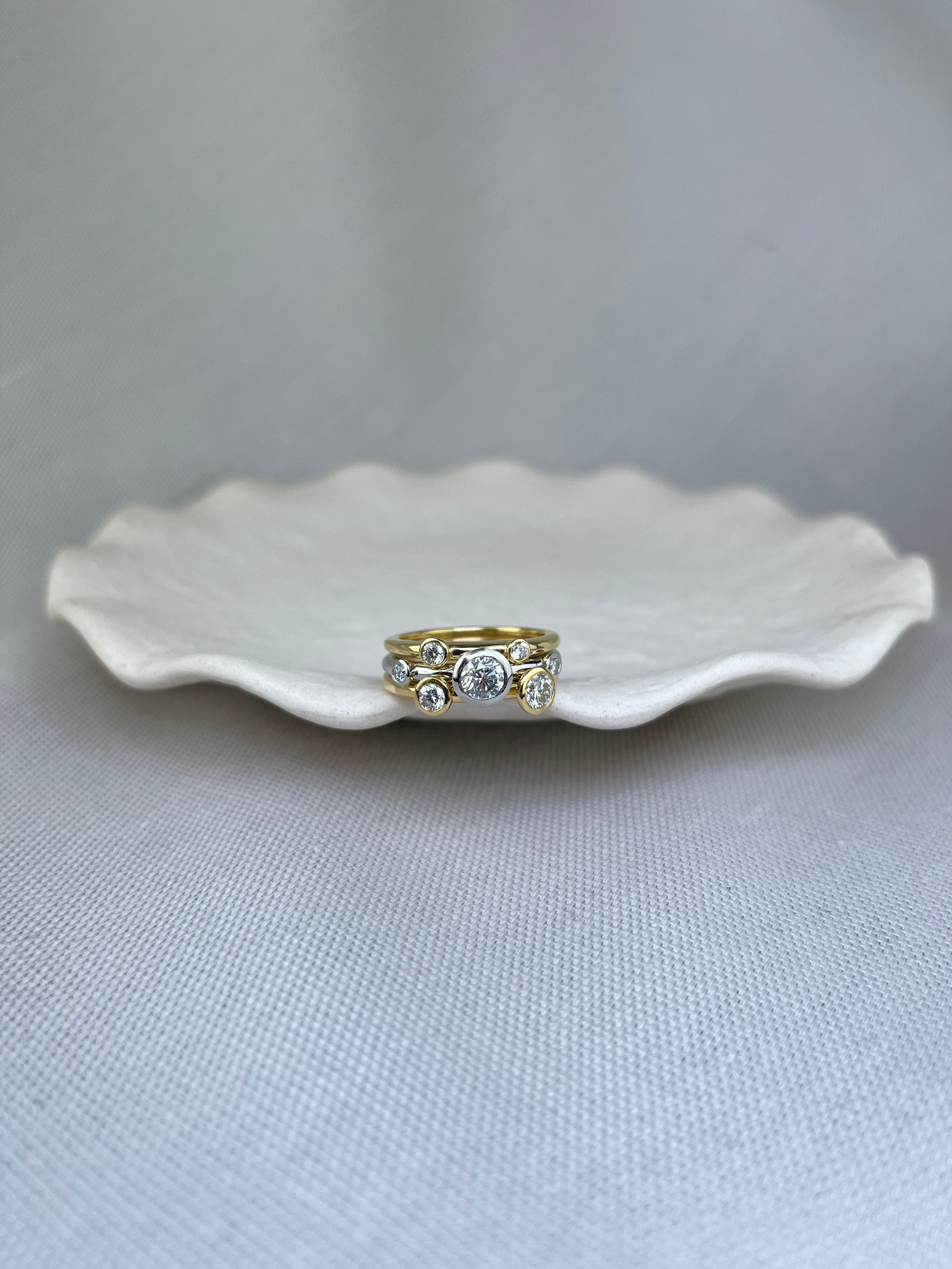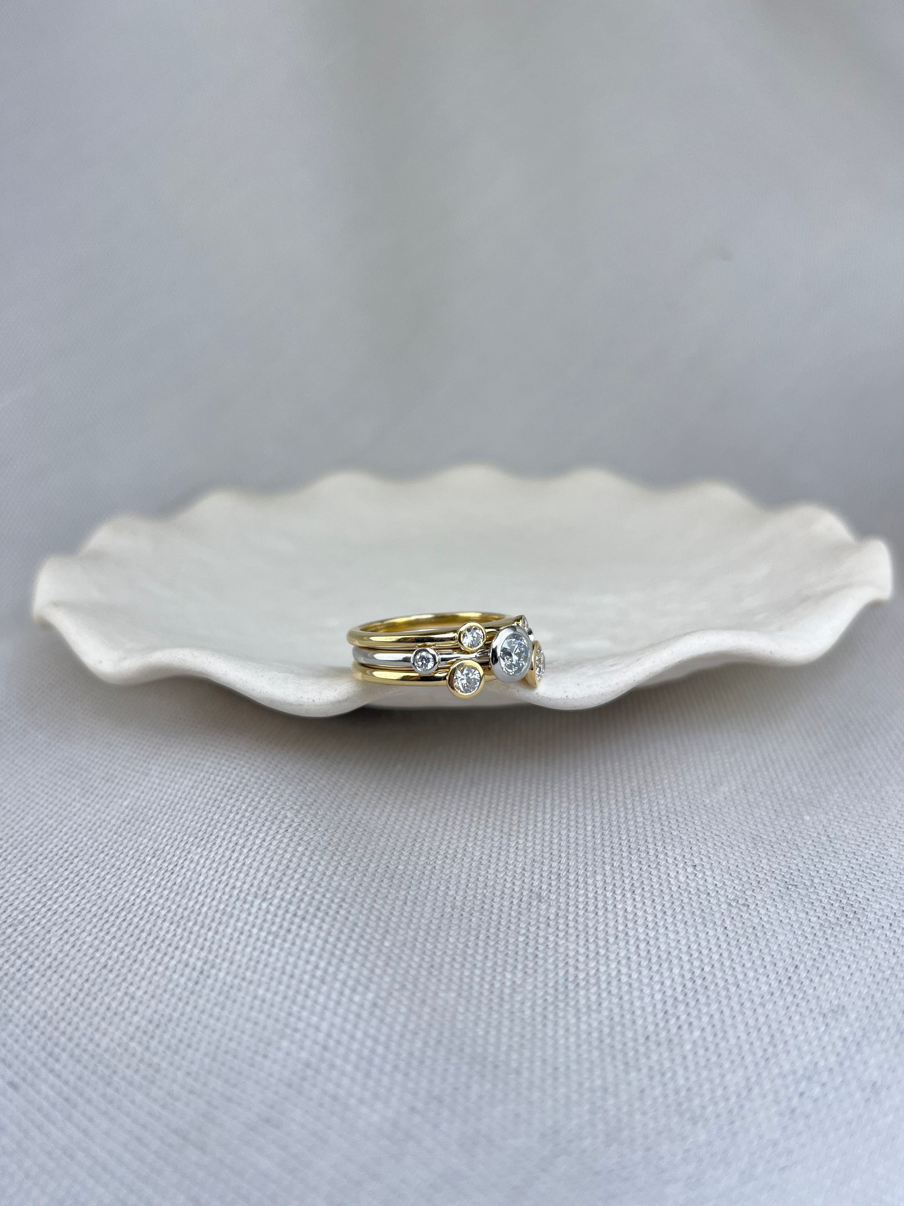 This set comprises a statement centrepiece ring made in platinum, flanked by a pair of matching stacking bands made from 18ct yellow gold. All are bezel set with assorted size round brilliant cut diamonds of almost a full carat in total, creating effortlessly stylish sparkle.