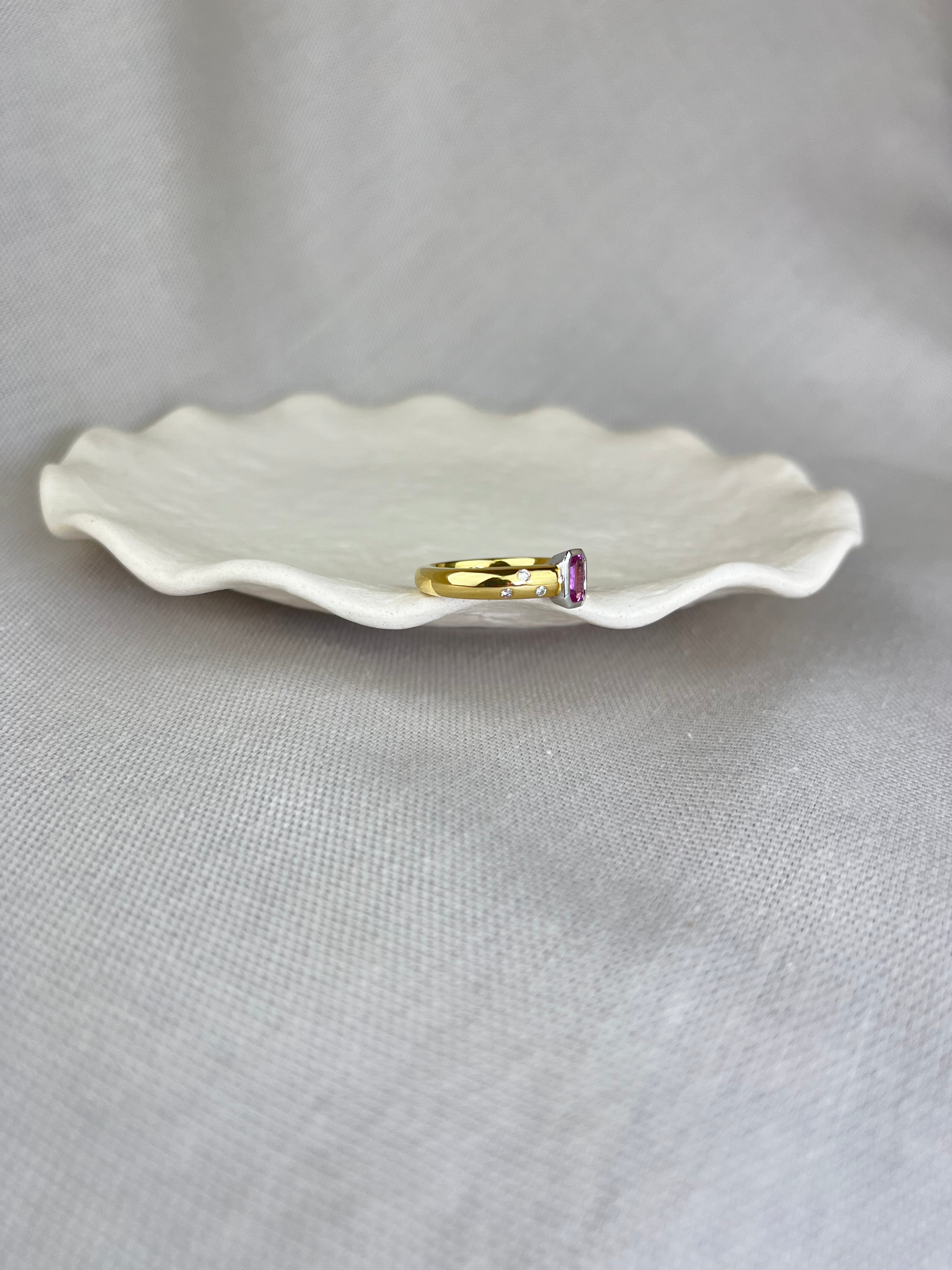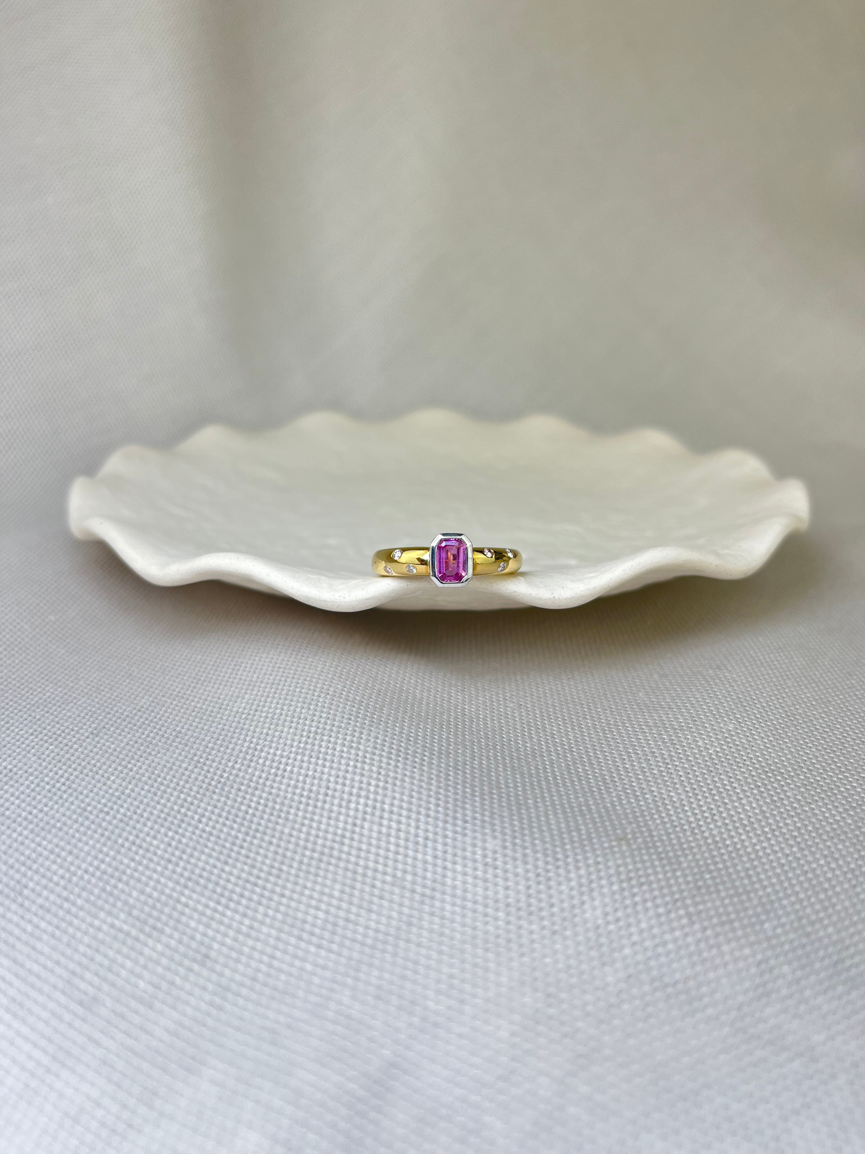 This fabulous pink stone nestles within an 18ct white gold bezel setting which accentuates it's octagonal shape. The rounded shank is made from contrasting 18ct yellow gold and is scatter set on either side of the central stone with a trio of round brilliant cut diamonds.