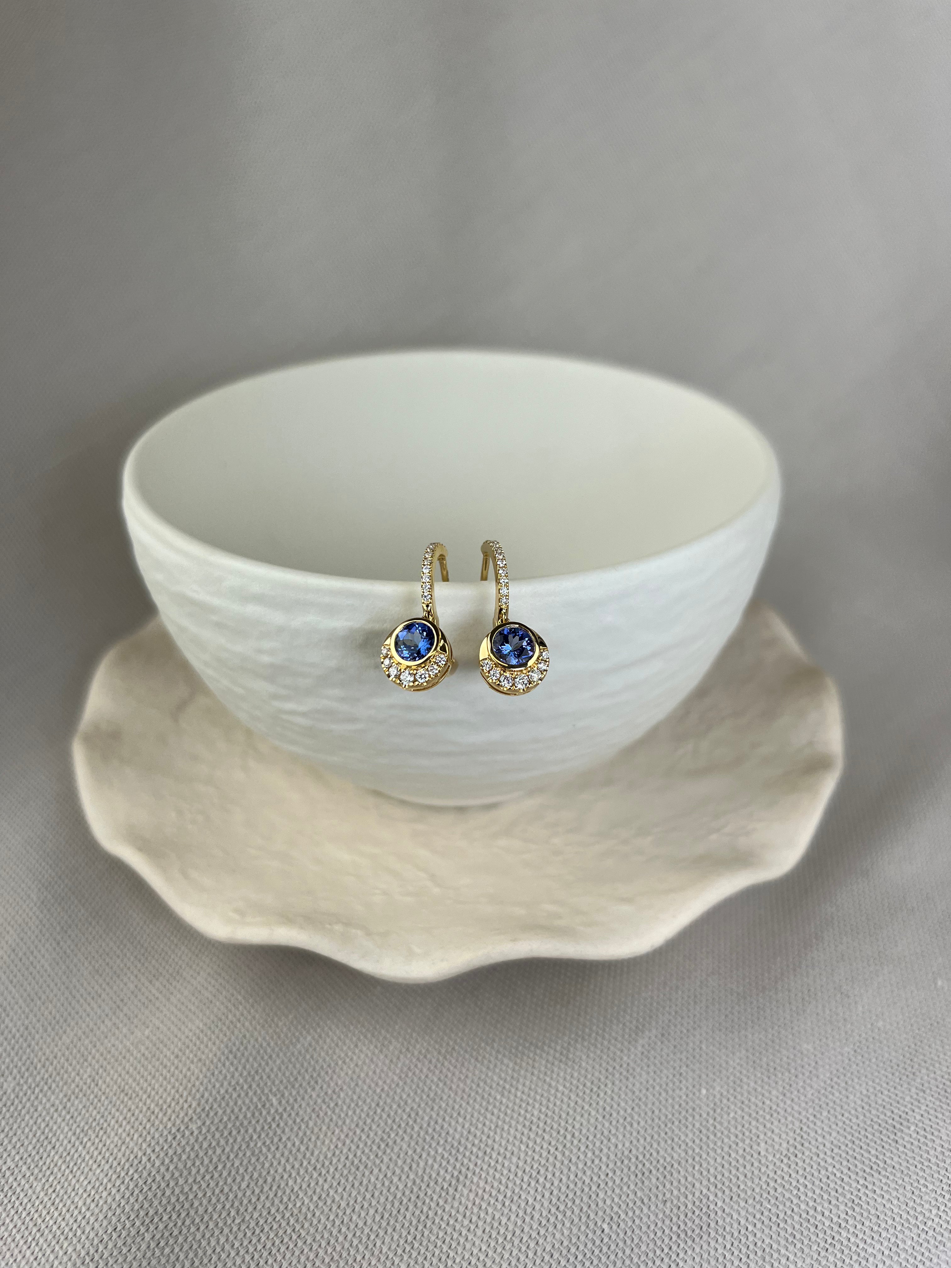 These beautiful 18ct yellow gold hoop earrings feature round tanzanite stones cupped elegantly by diamond crescent moons.
