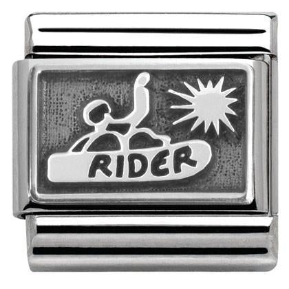 Composable Classic size charm in stainless steel with sterling silver oxidised detail Rider message with Snowboard symbol.