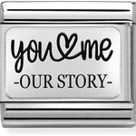 Composable Classic size charm in stainless steel with sterling silver You Me - Our Story message.