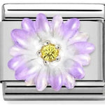 Composable Classic size charm in stainless steel with sterling silver yellow cubic zirconia lilac enamel Flower symbol.