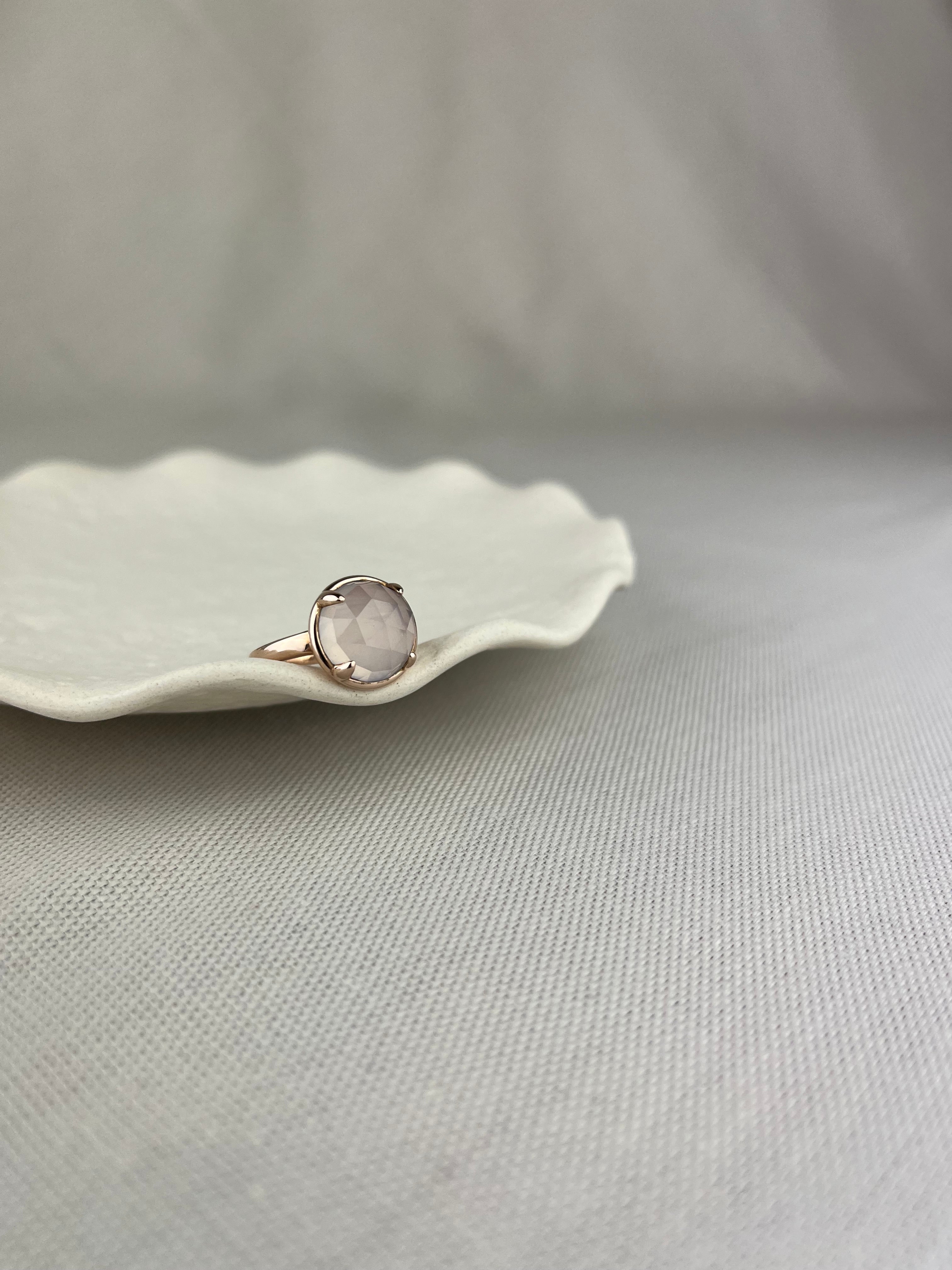 This example is made in 9ct rose gold and set with a large rose-cut faceted rose quartz.