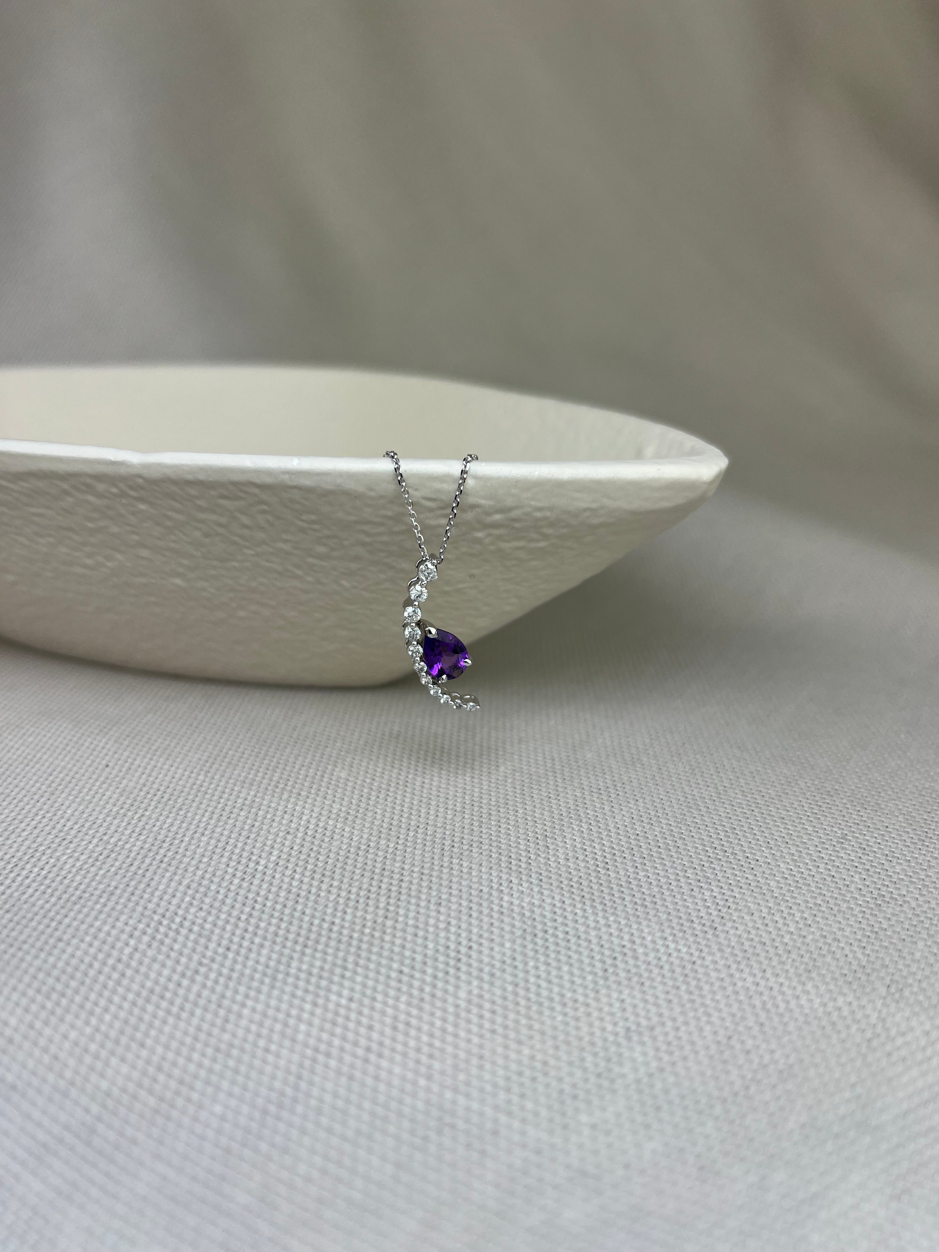 This stunning pendant is as delicate as it is unusual. Featuring a sweeping curl of round brilliant cut diamonds graduating in size, gently caressing a deep purple faceted pear shape amethyst in claw setting.