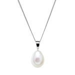 This elegant example showcases a drop shape white river cultured pearl mounted on a 9ct white gold plain tapered pendant loop.