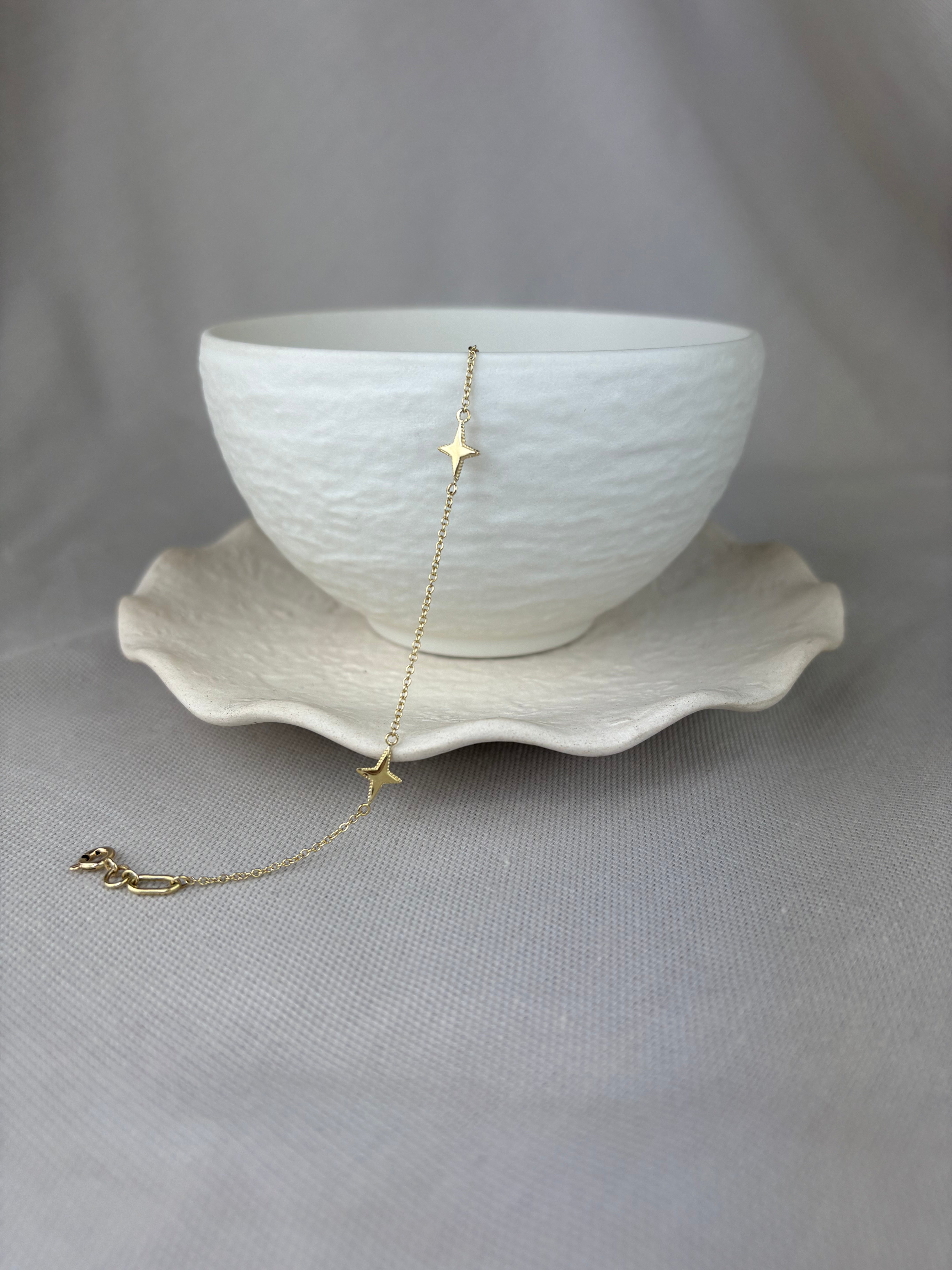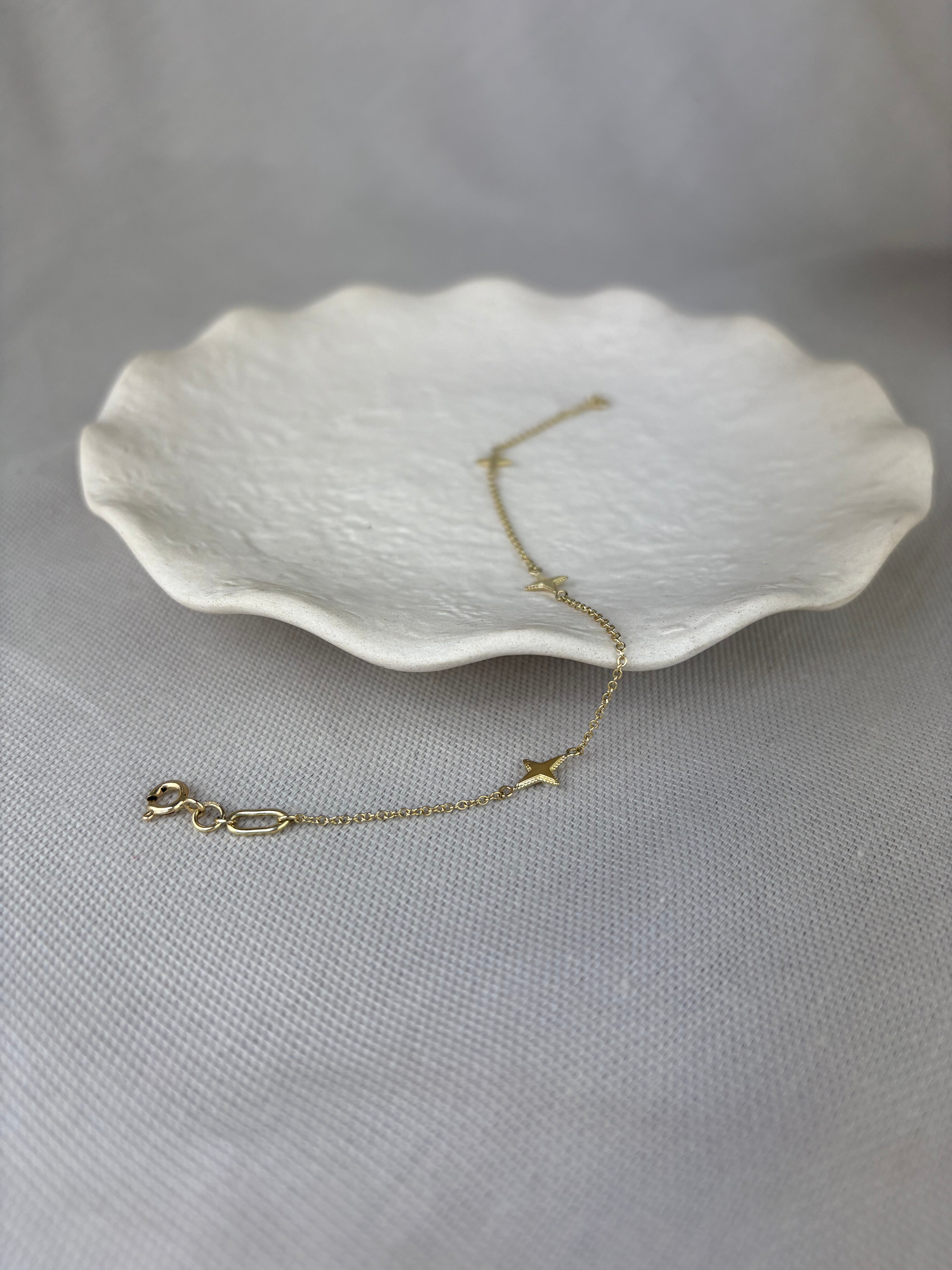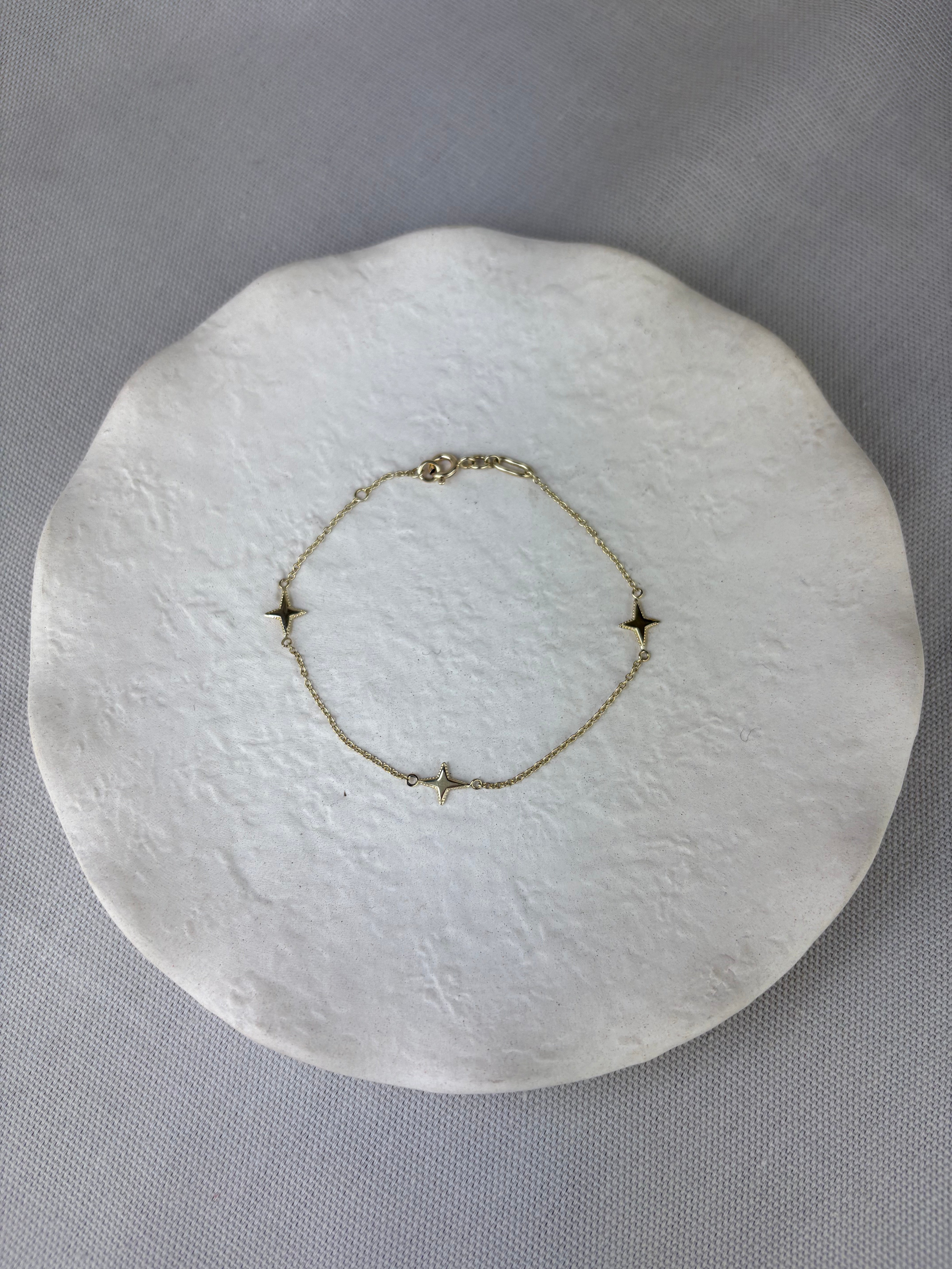 This special four-pointed star station bracelet is made from 9ct yellow gold with a bolt ring fastener.