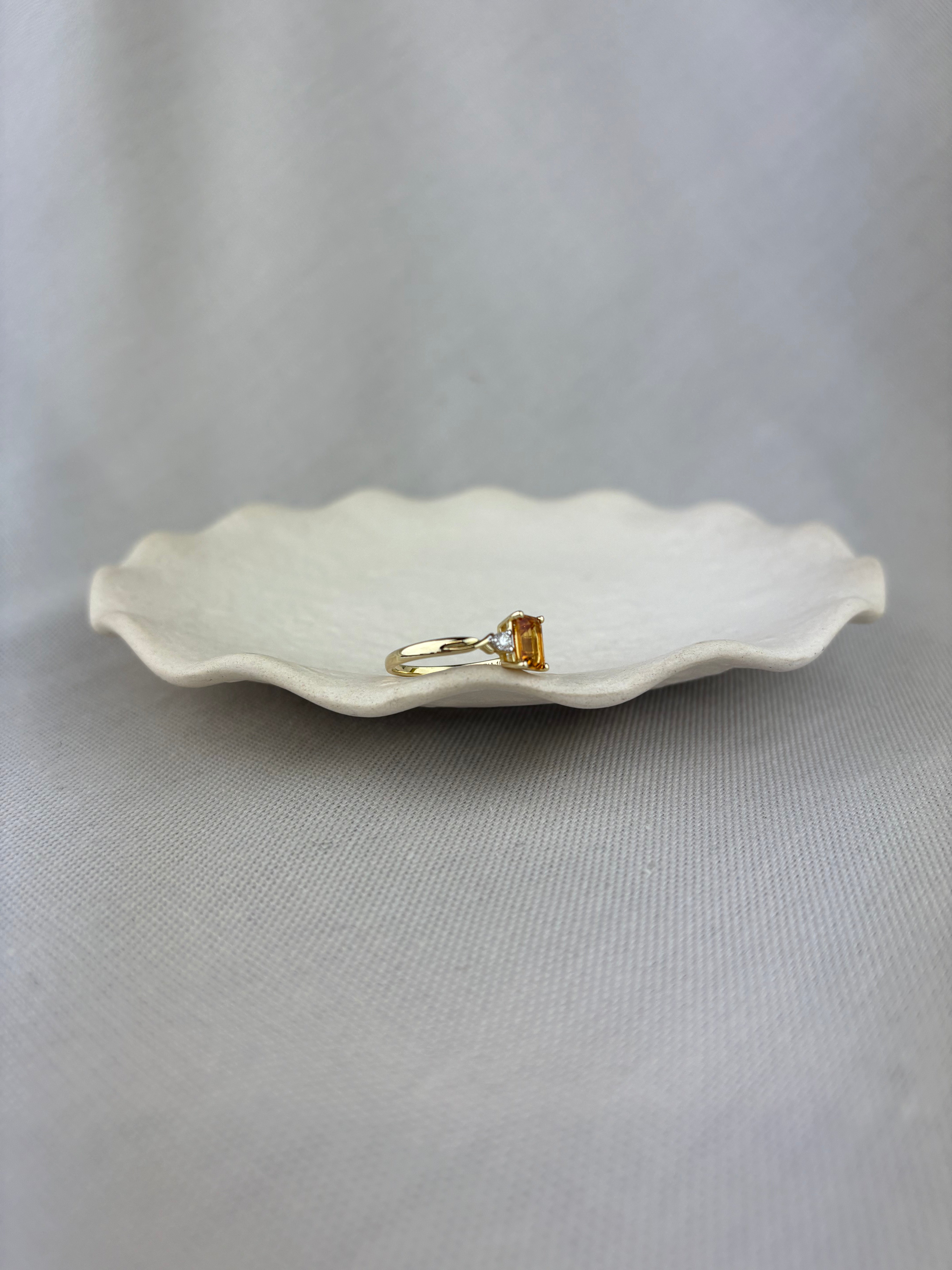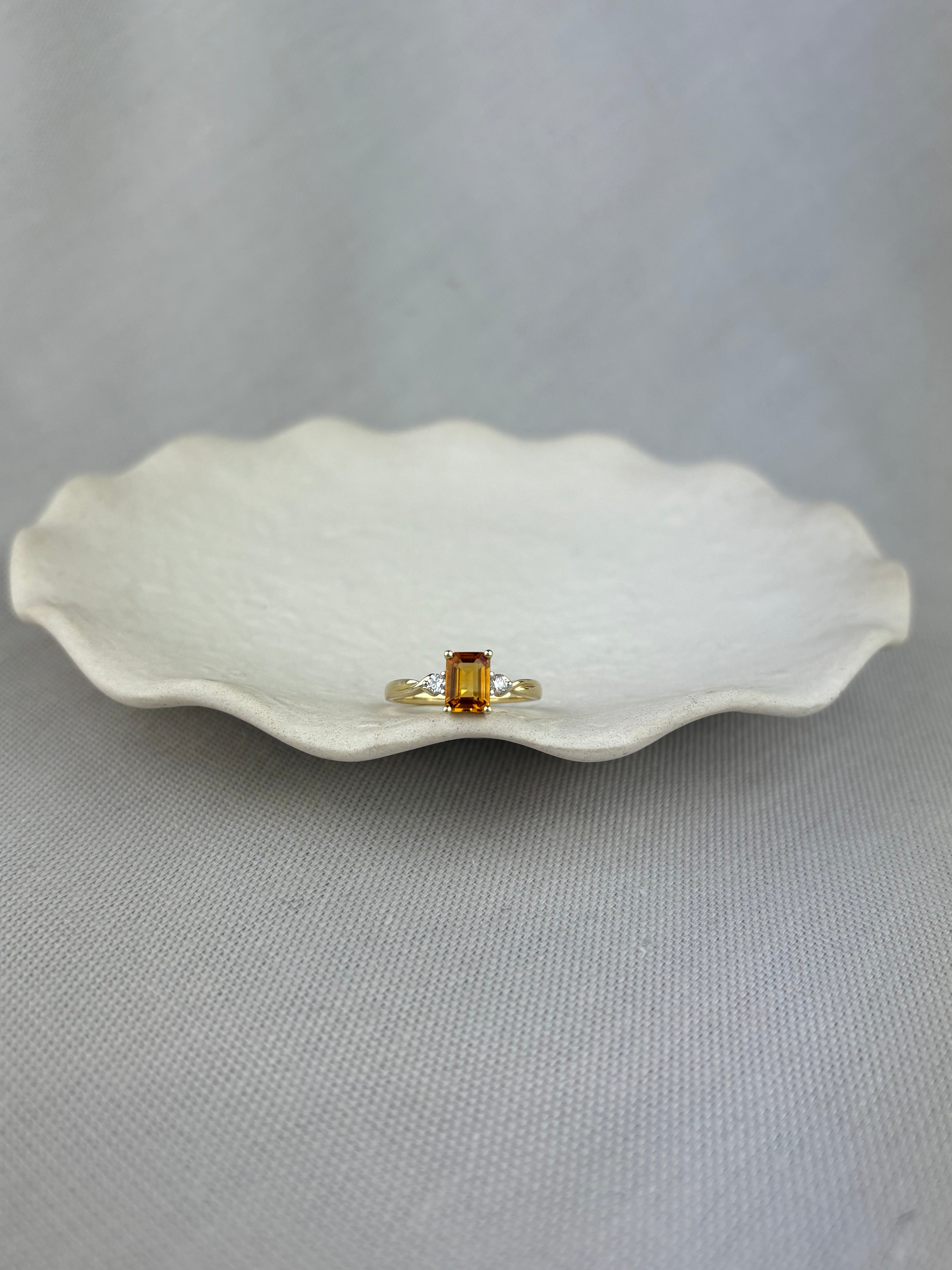 Seen here in 9ct yellow gold and set with an emerald cut citrine flanked by a pair of round brilliant cut diamonds, this pretty version of a trilogy ring has a twist in the shoulder which creates an elegant and flattering shape on the finger.