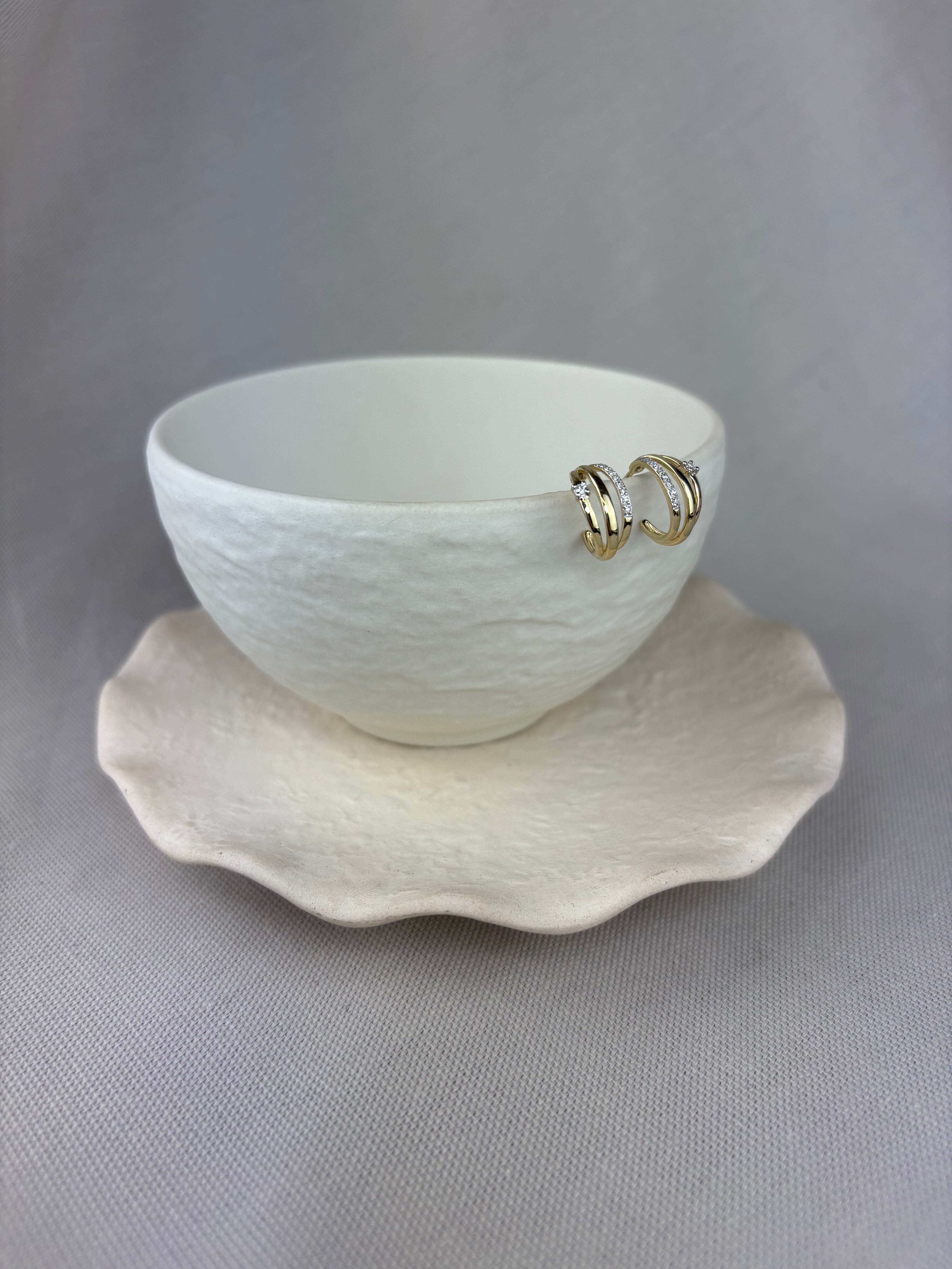 This fabulous pair features three gathered strands of 9ct yellow gold with claw and grain set diamond detail.