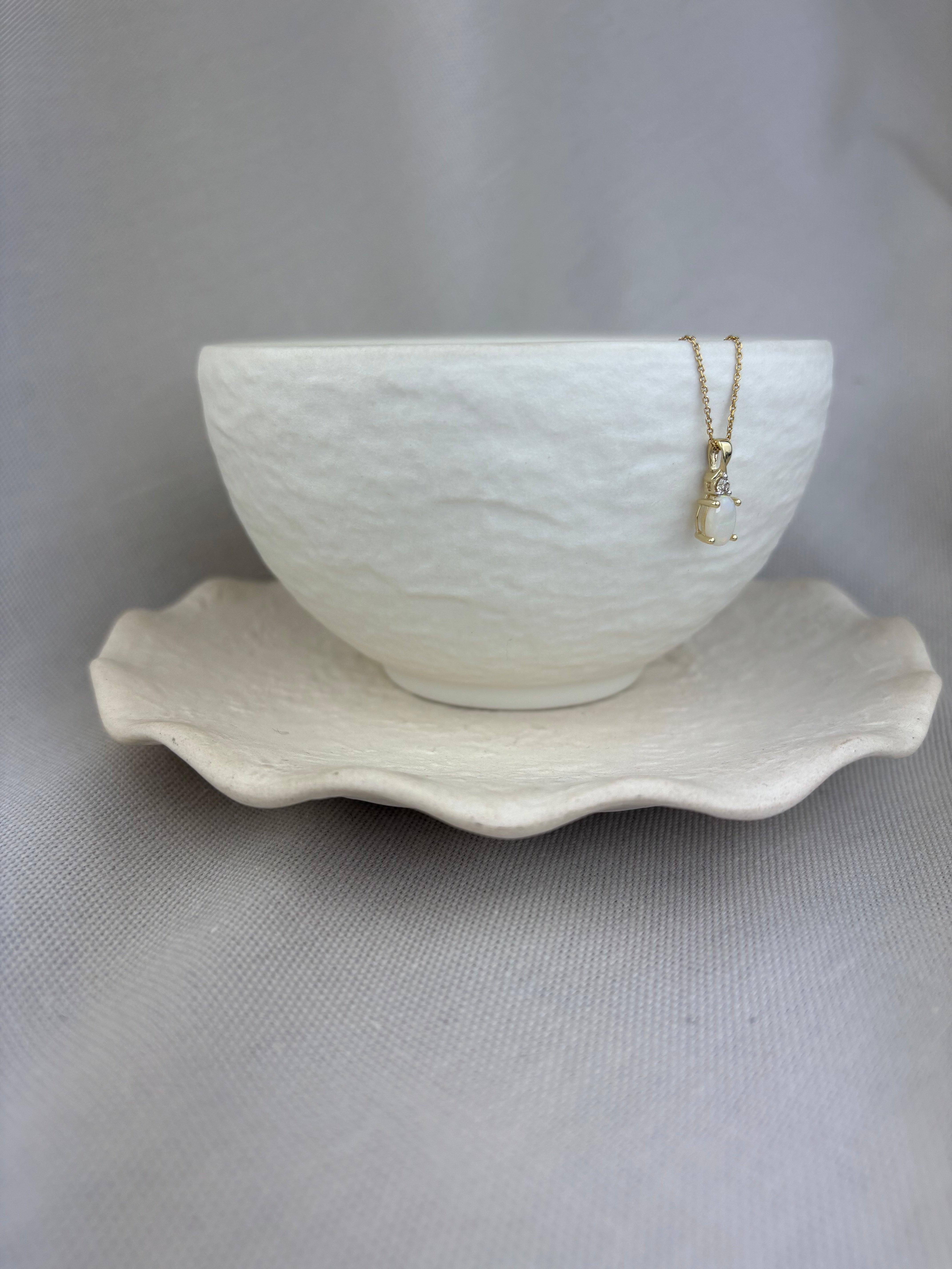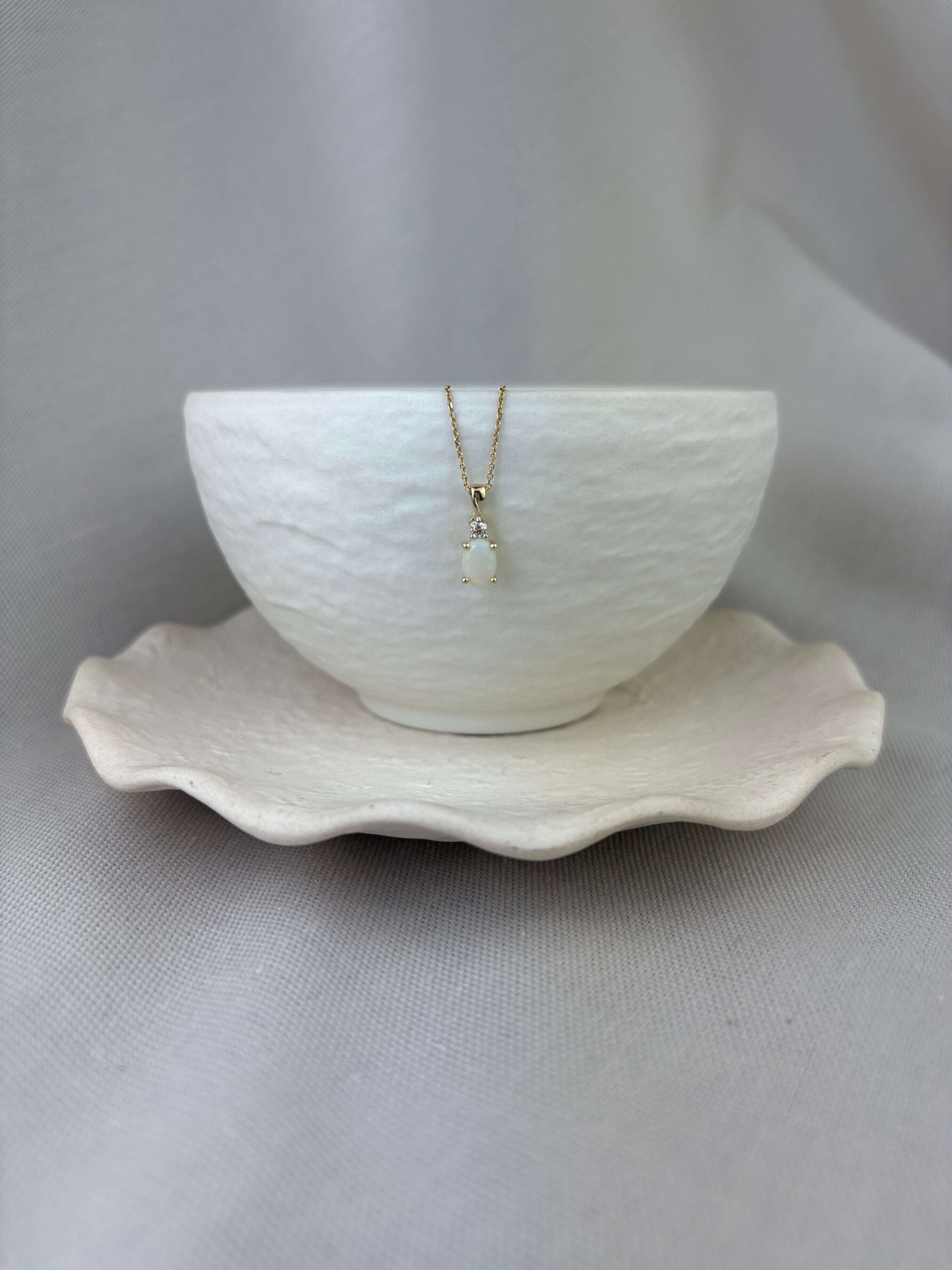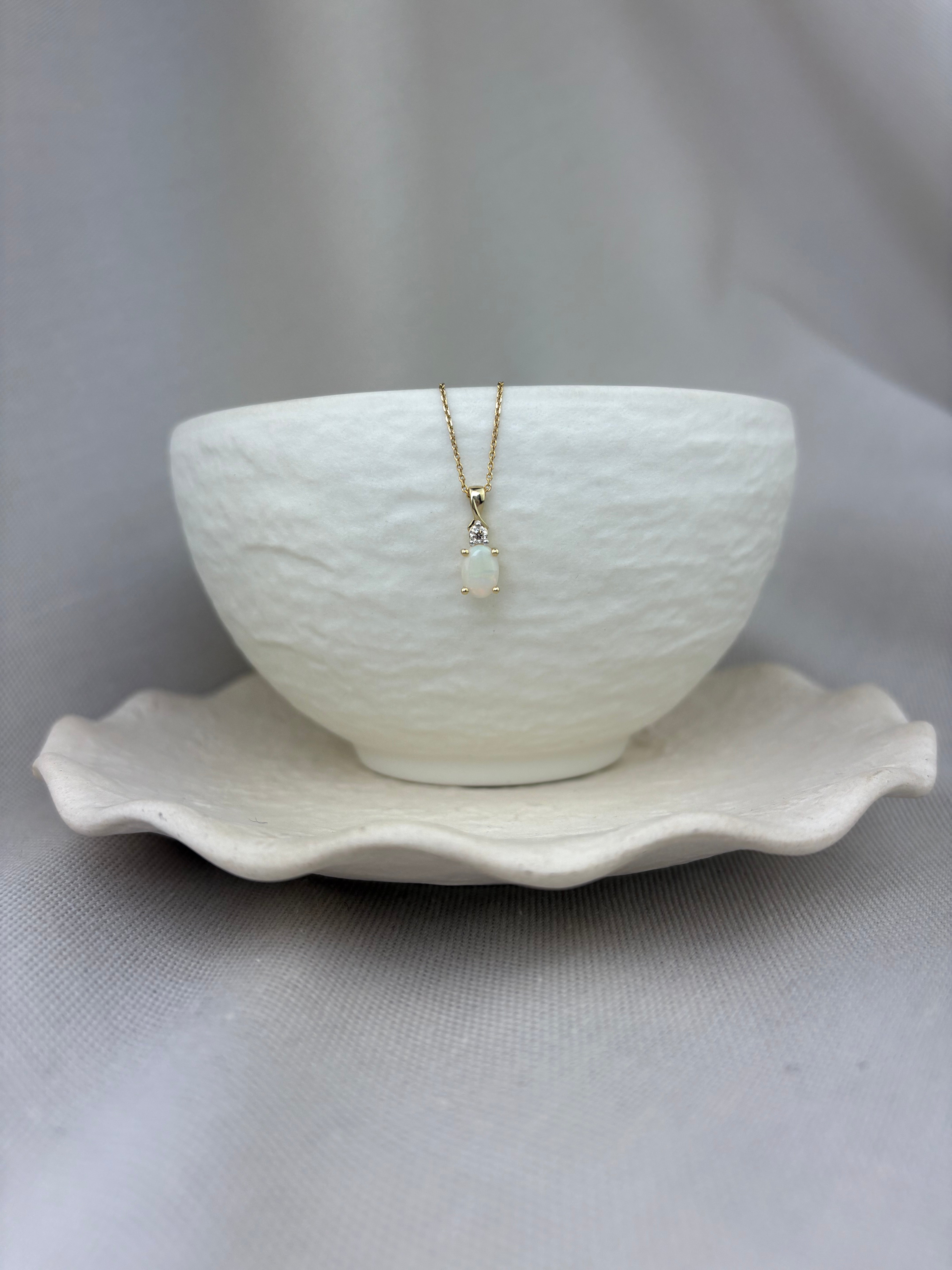 This 9ct yellow gold pendant showcases a cabochon oval opal suspended beneath a round brilliant cut diamond and a petite twist top pendant loop.