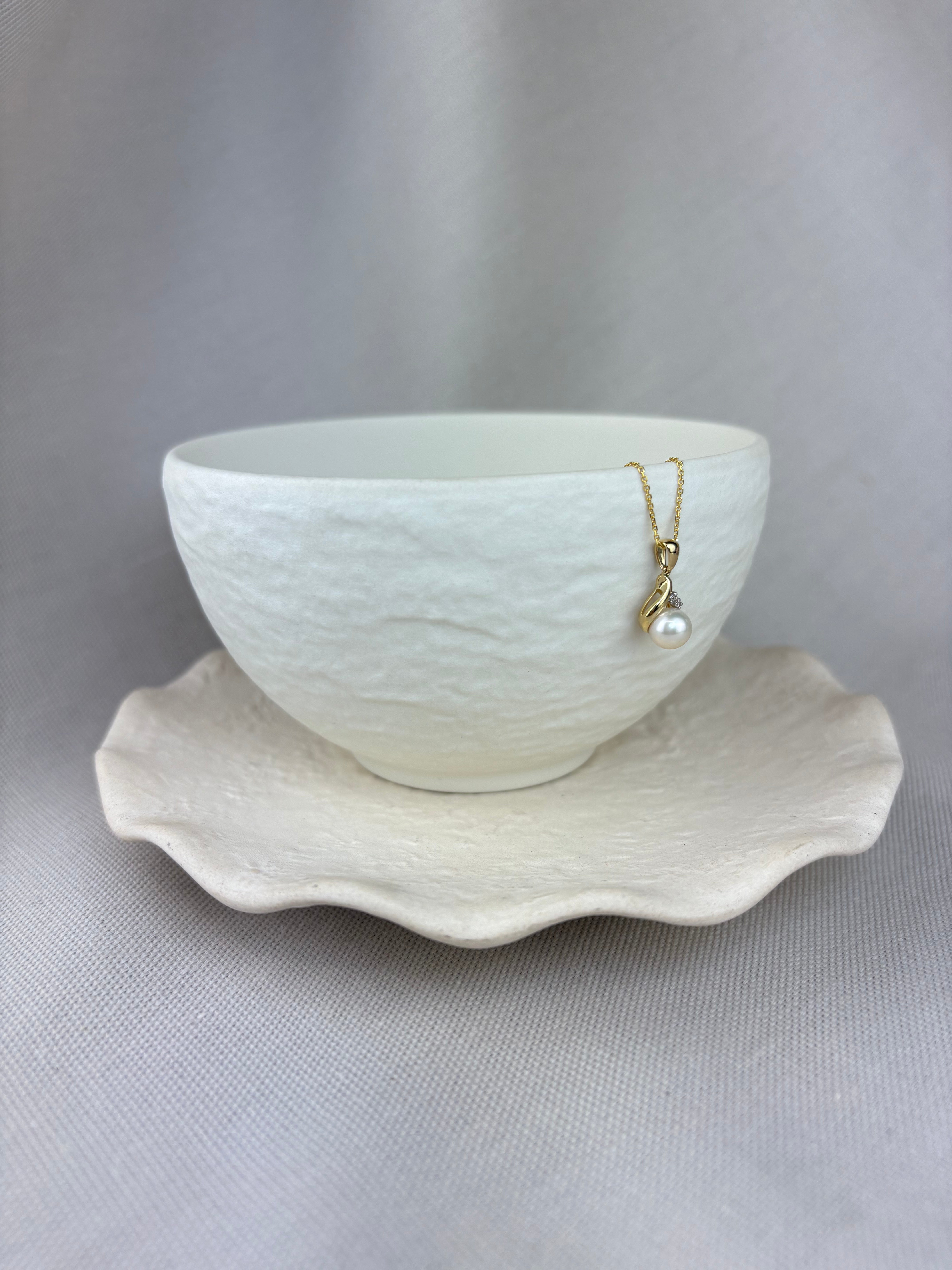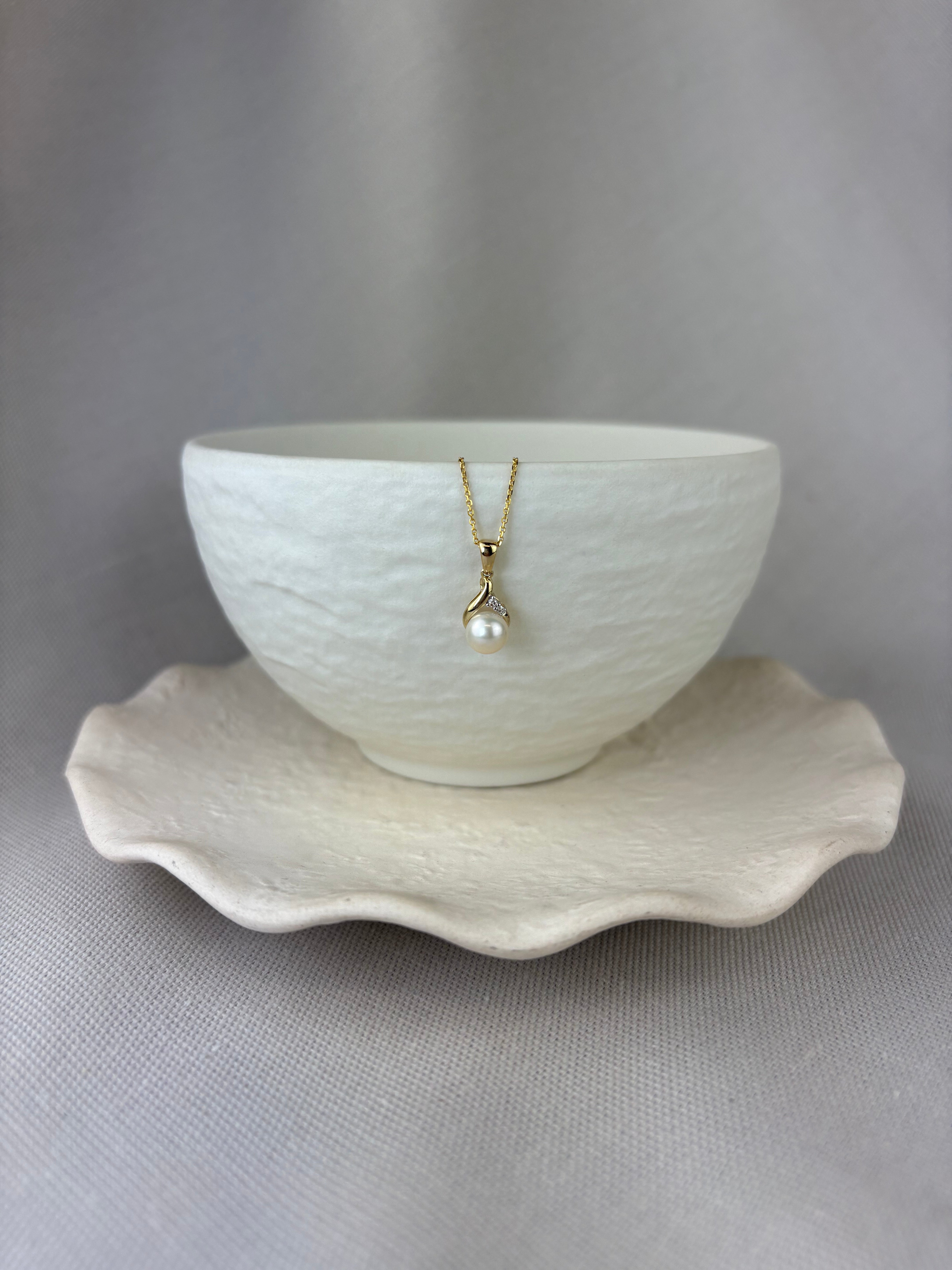 This delightful 9ct yellow gold pearl and diamond pendant is made with a wishbone detail and a plain tapered pendant loop: