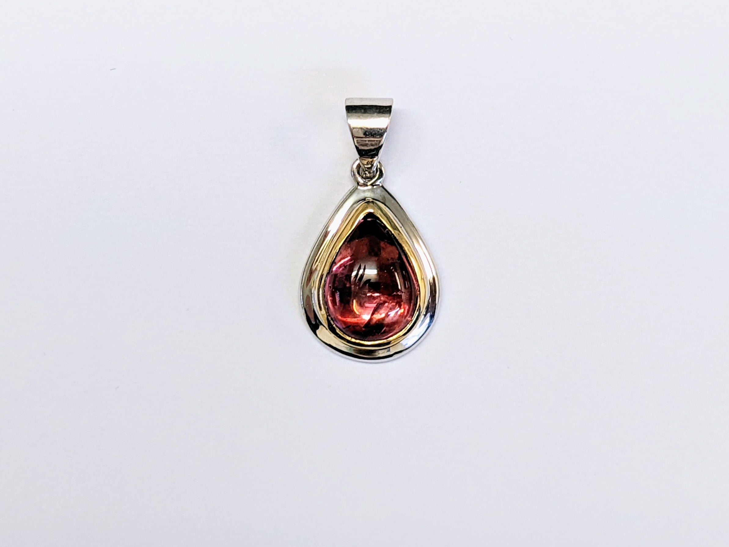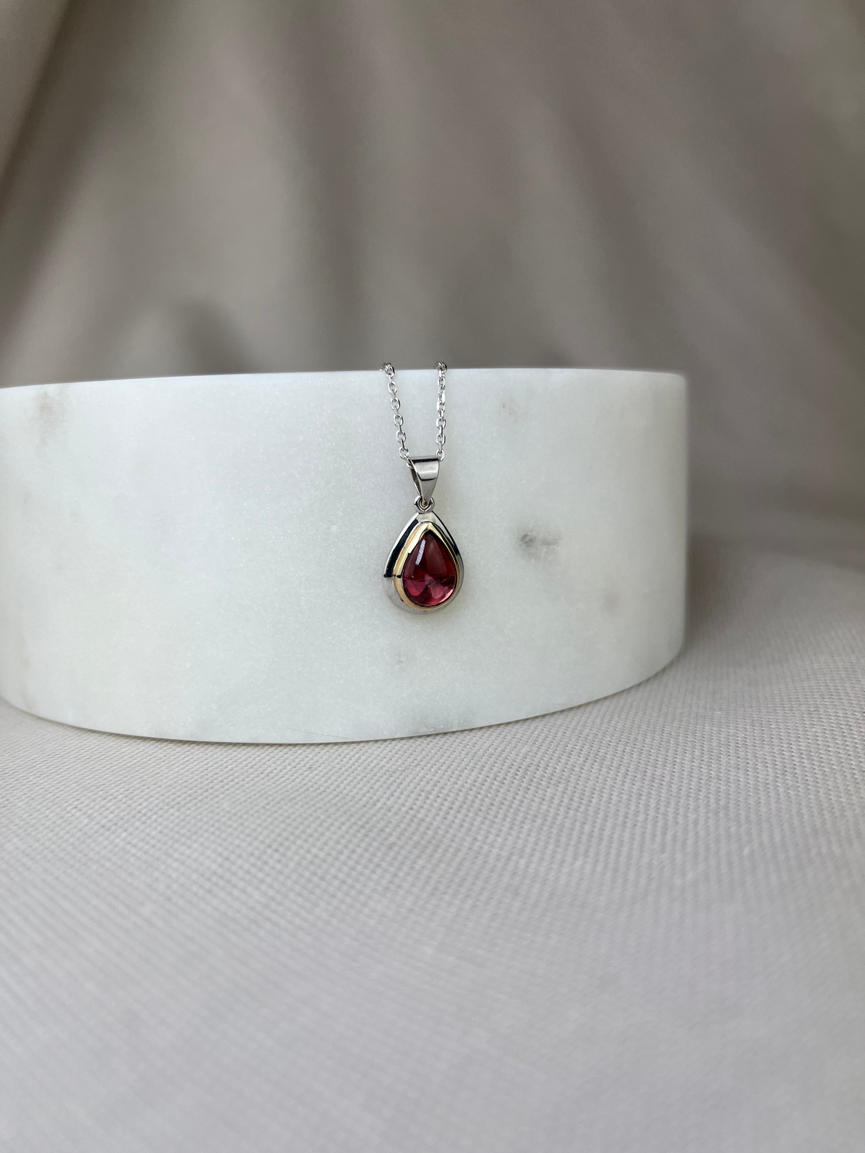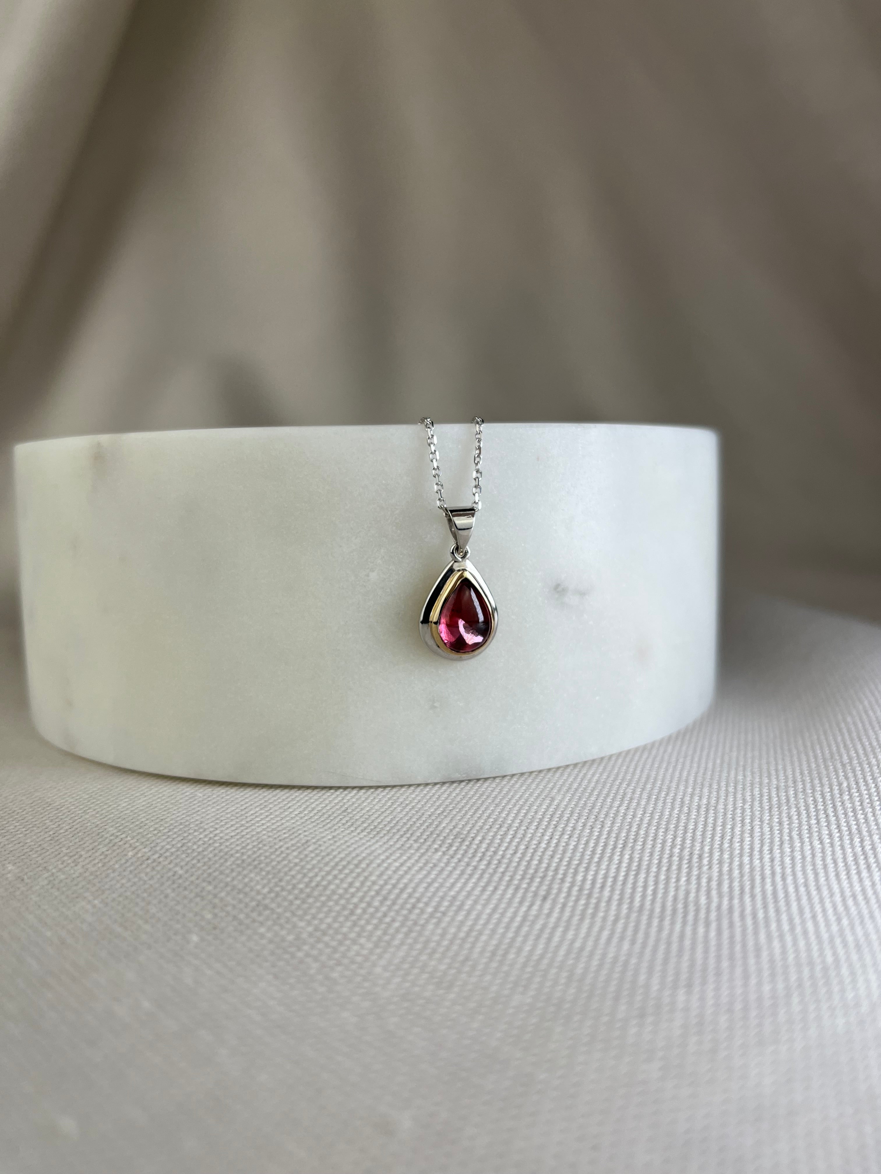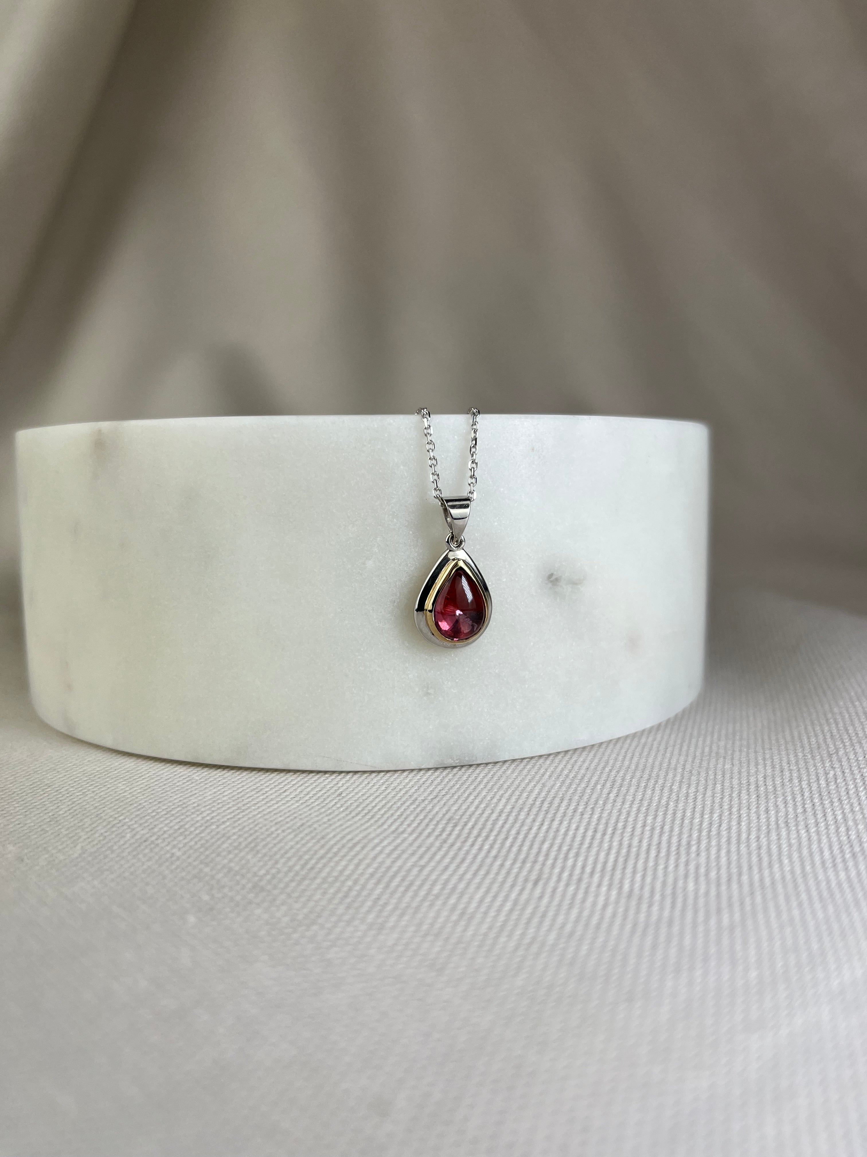This handmade 9ct yellow and white gold double bezel set pendant showcases the rich deep pink colour of natural tourmaline.