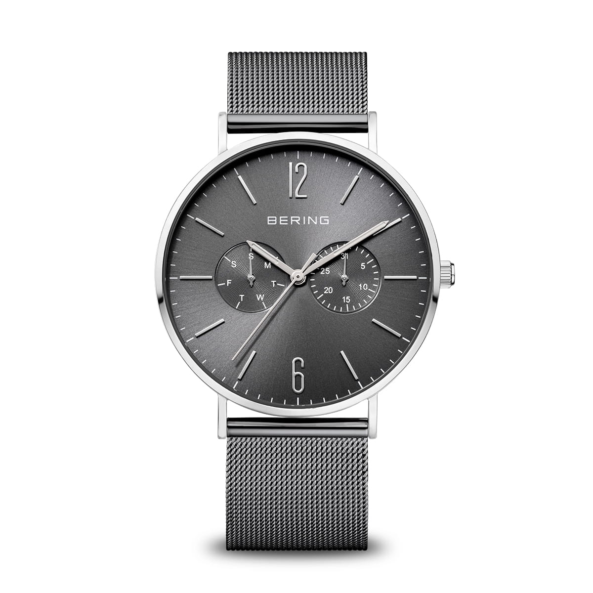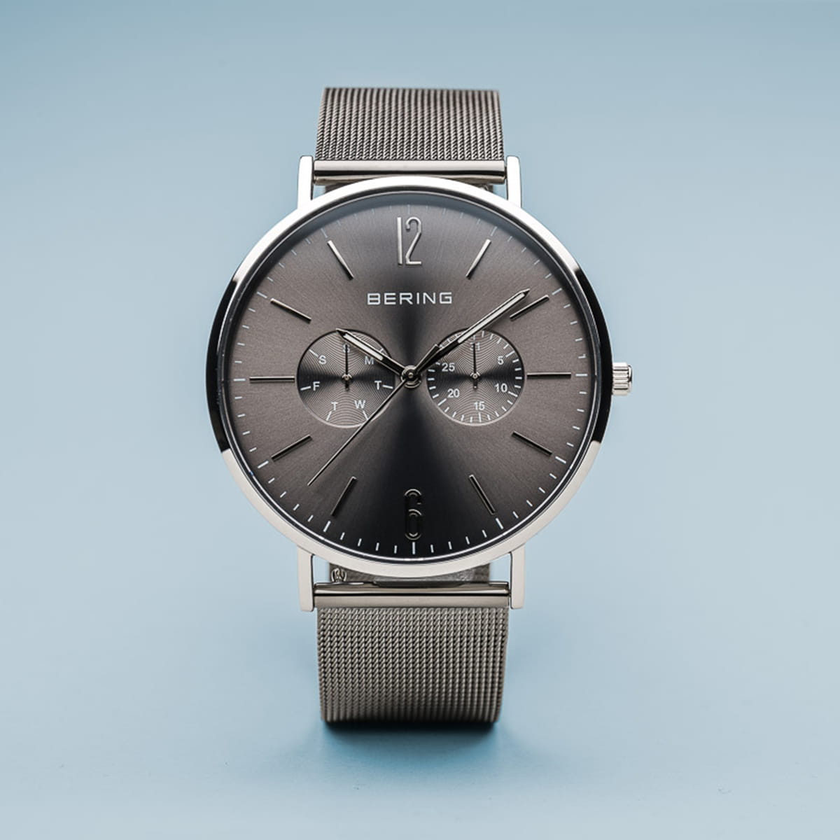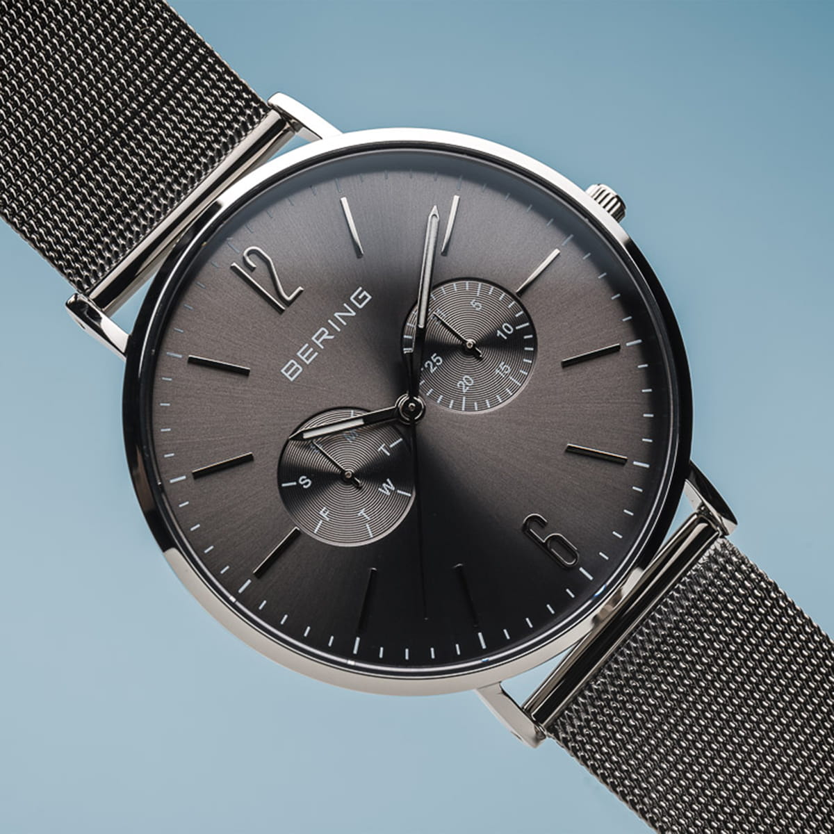 The polished stainless steel case, made of pure, high quality, medical-grade stainless steel (316L), combines with the modern Milanese strap, to provide the classic Bering look. A dial embellished with chronograph function is protected by crystal clear, scratch-resistant sapphire crystal glass.