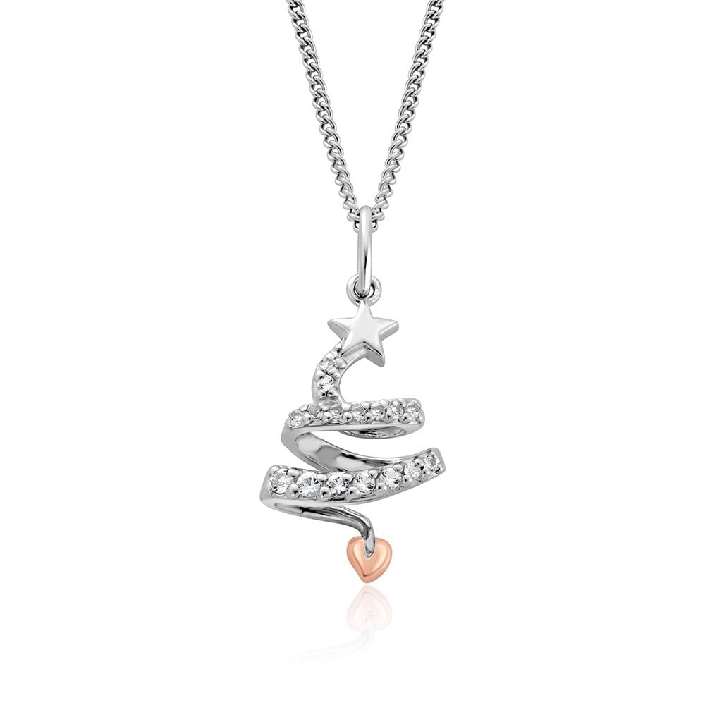 Let the Yuletide spirit flow with our Clogau Christmas Tree Silver Necklace, featuring a sterling silver setting adorned with 9ct rose gold detailing and sparkling white topaz decorations.