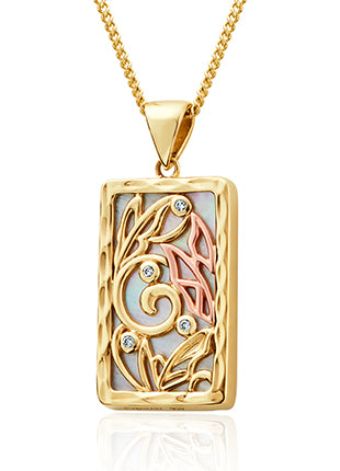 Represented here in this luxurious 9ct Solid Gold Necklace backed with Mother of Pearl and featuring sparkling diamond, the design features a whimsical and elegant motif which is sure to delight.