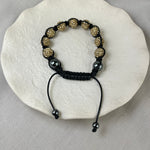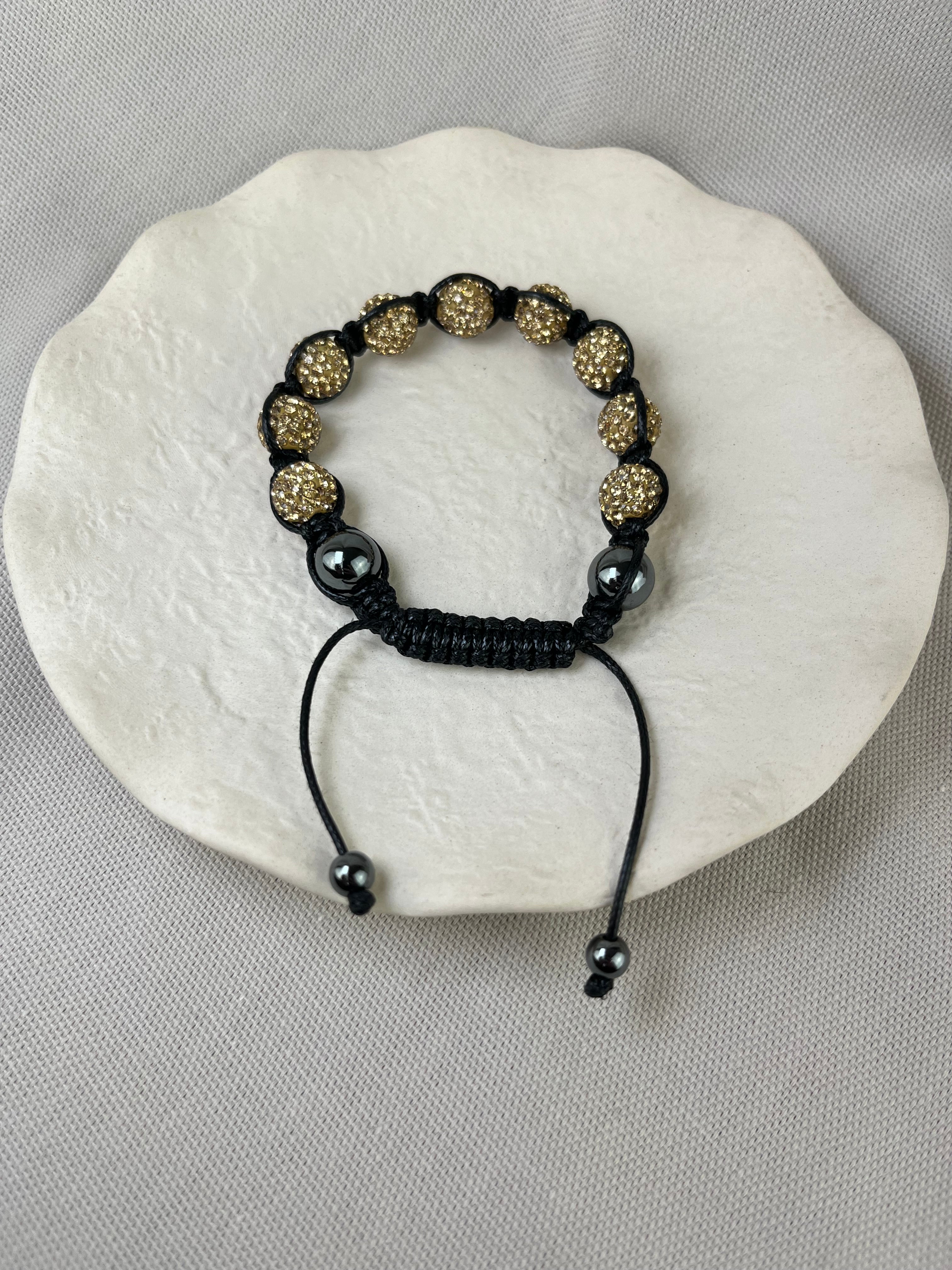 This example features round golden beads embedded with champagne crystals for a sparkling finish and hematite bead finials to both the bracelet and drawstring.