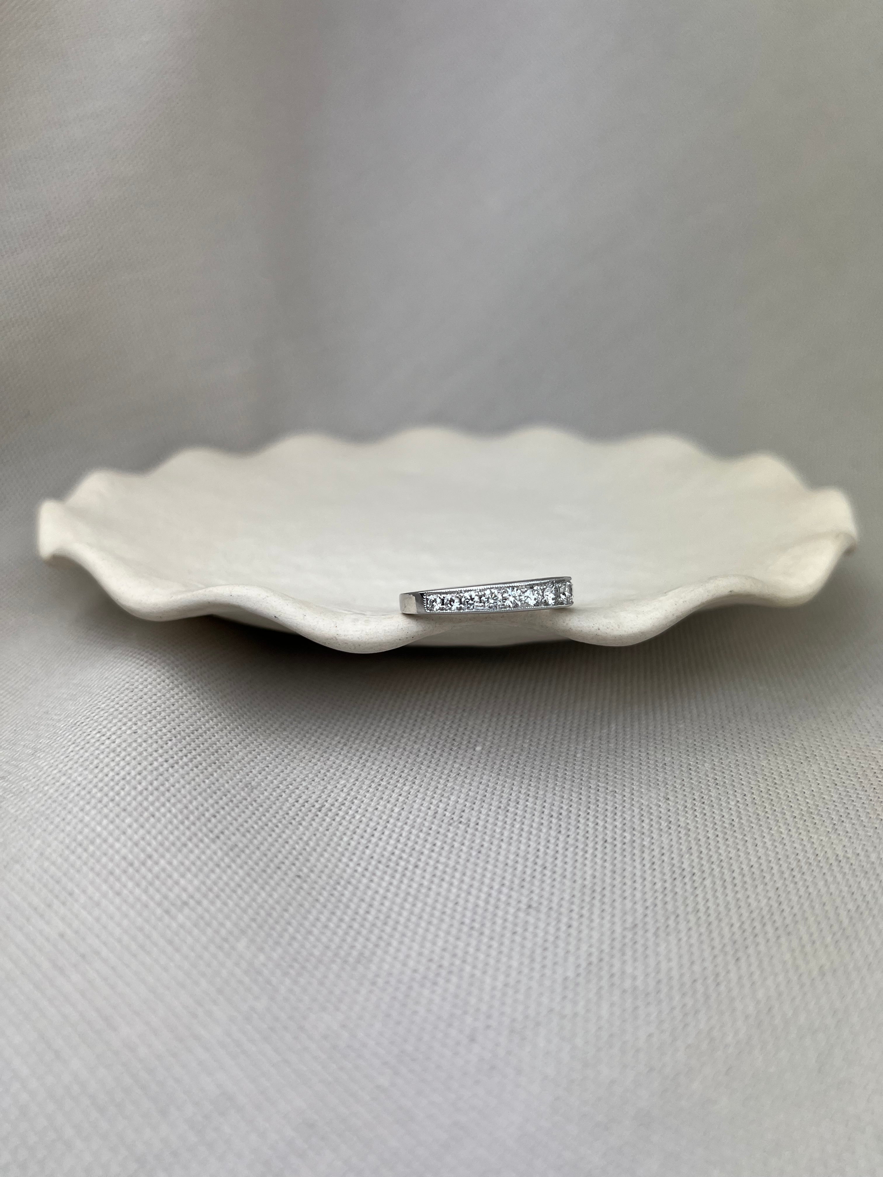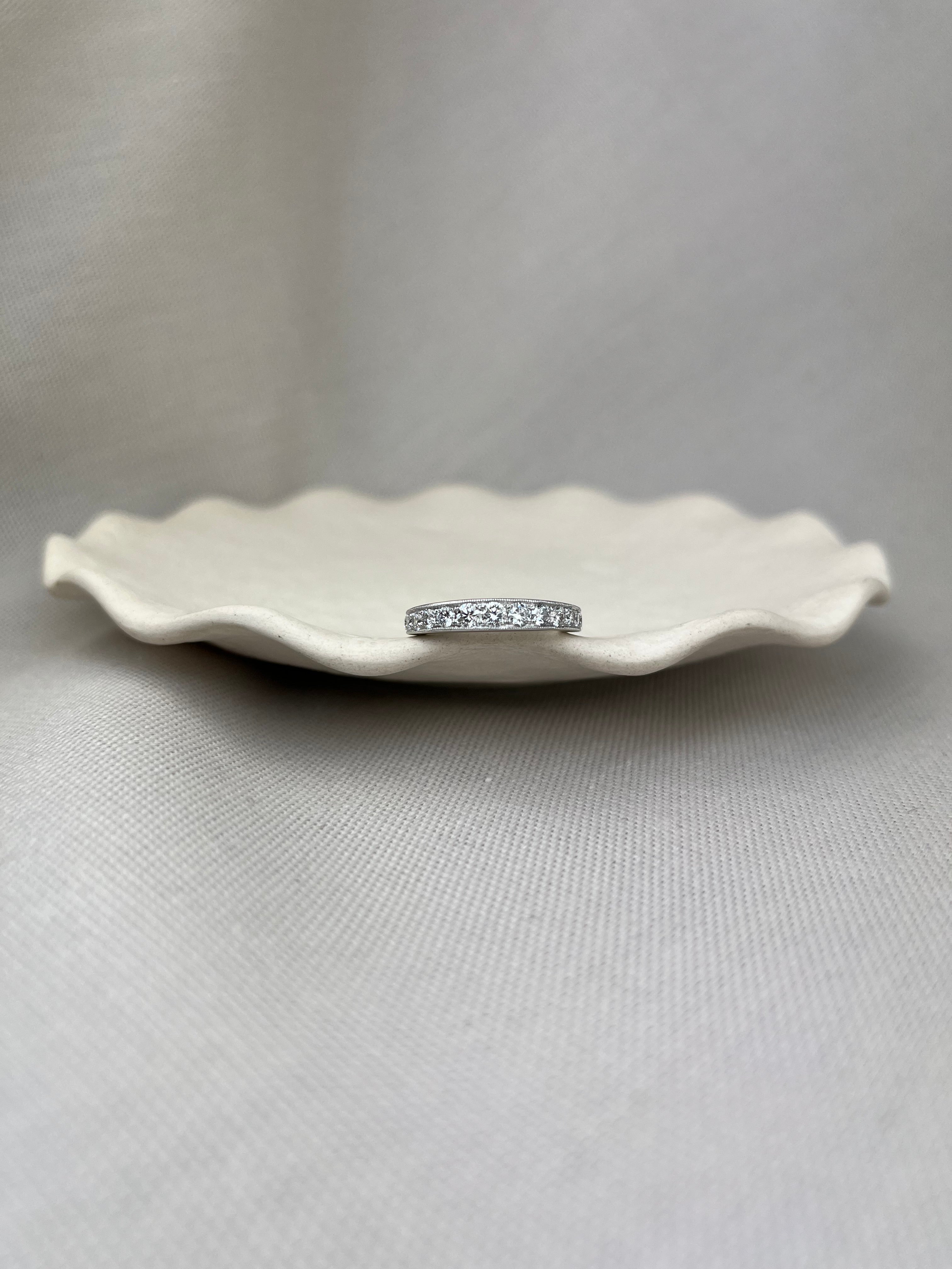 The platinum ring band is set with fifteen round brilliant cut diamonds, graduating in size and nestled within a beaded edge pave setting.