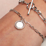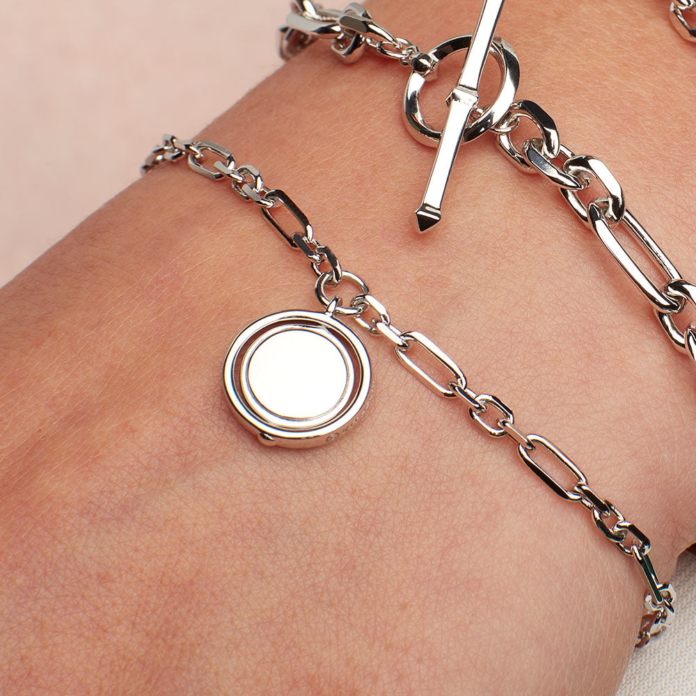 Made in sterling silver, the bold lines of the alternating chain links complement the retro ‘Revival’ style of the coin-like spinning disc.