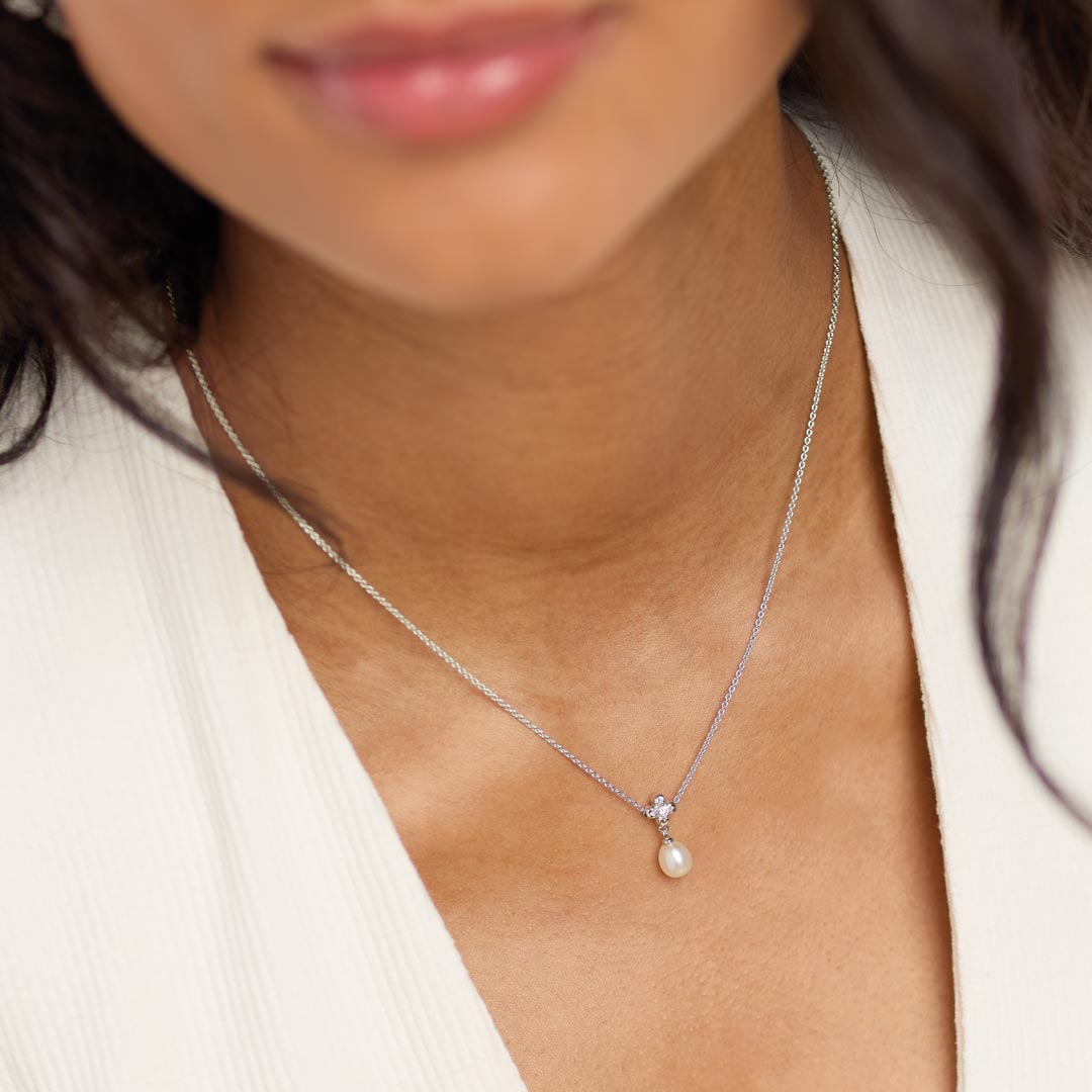 Featuring a lustrous Freshwater Pearl pendant, the necklace is detailed with our delicate and charming Honey Flower motif along the pendant bale, with a sparkling Cubic Zirconia adorning the centre of the flower.