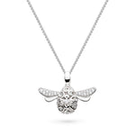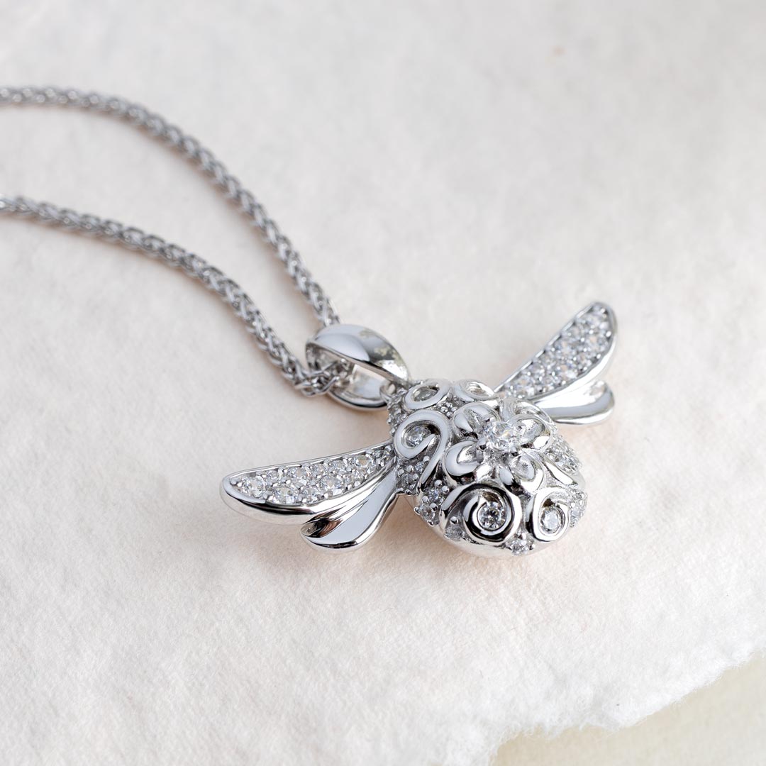 Featuring a large Sterling Silver Queen Bee pendant on a long 20-inch chain, this statement piece glows with sparkling Cubic Zirconia accents on the wings and body, making it a dazzling highlight.