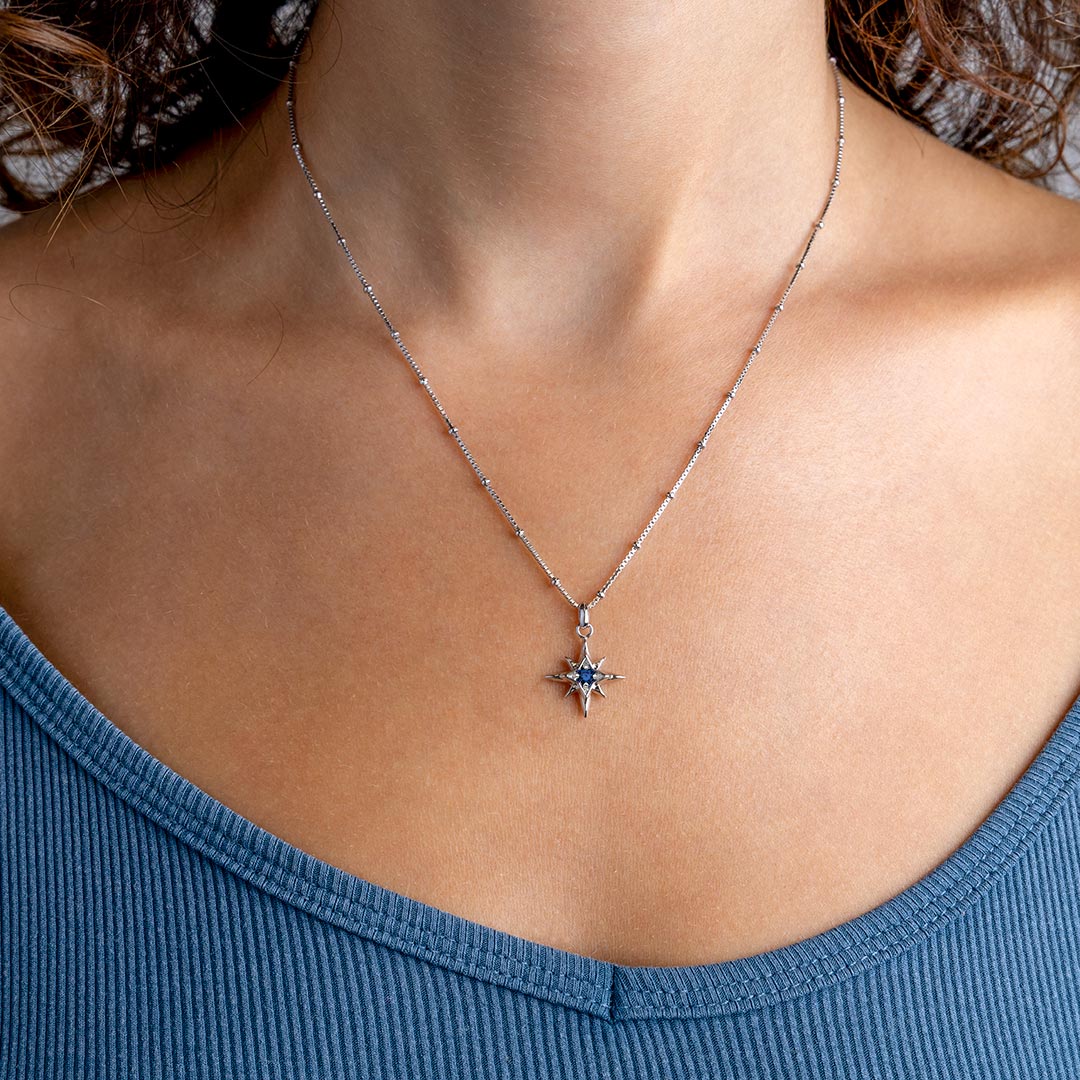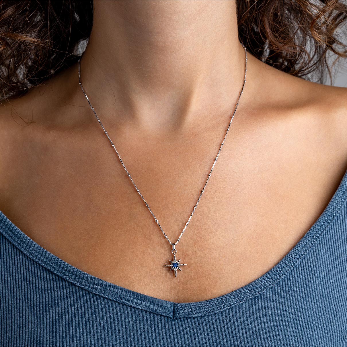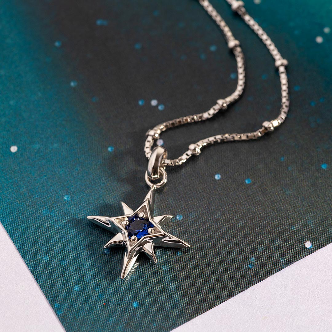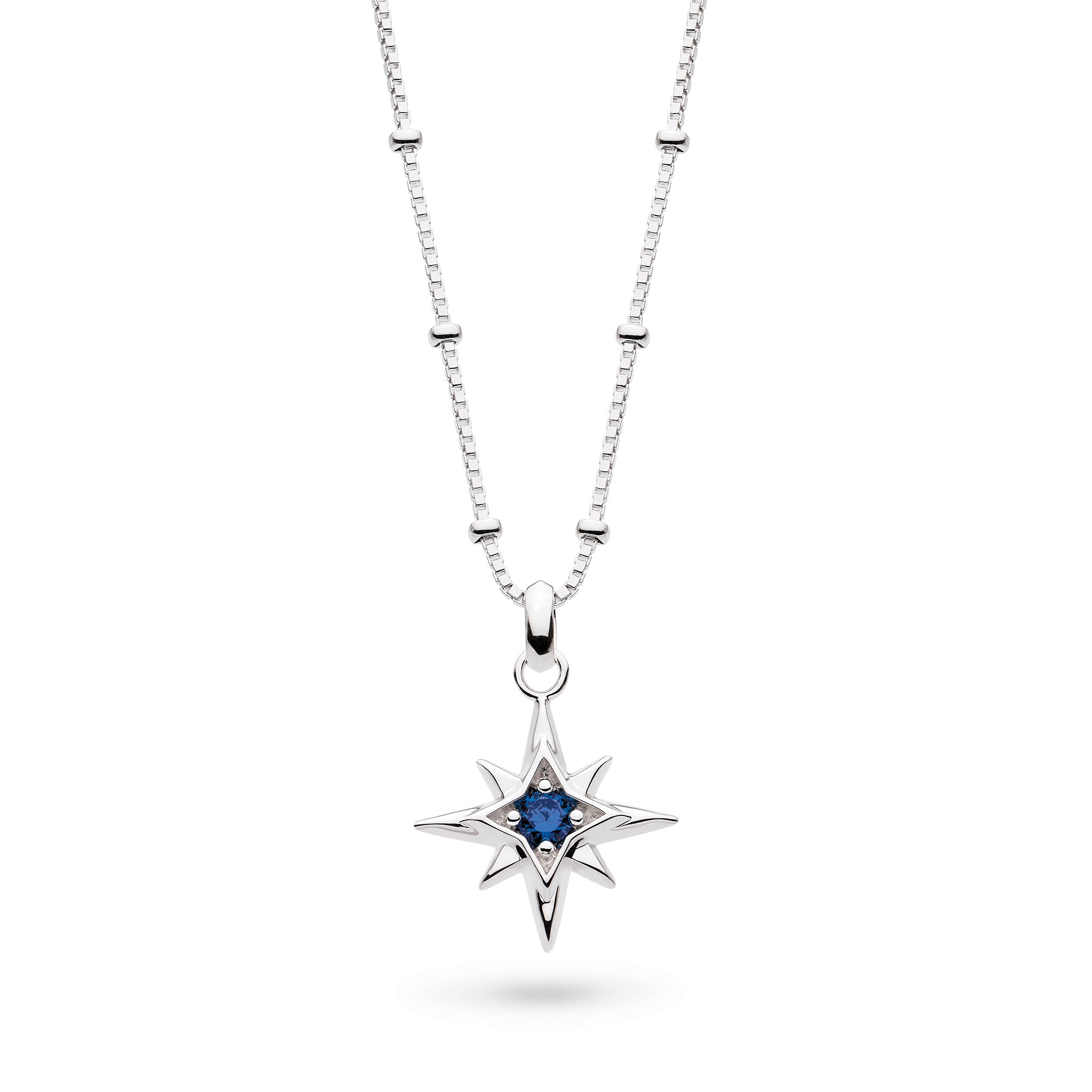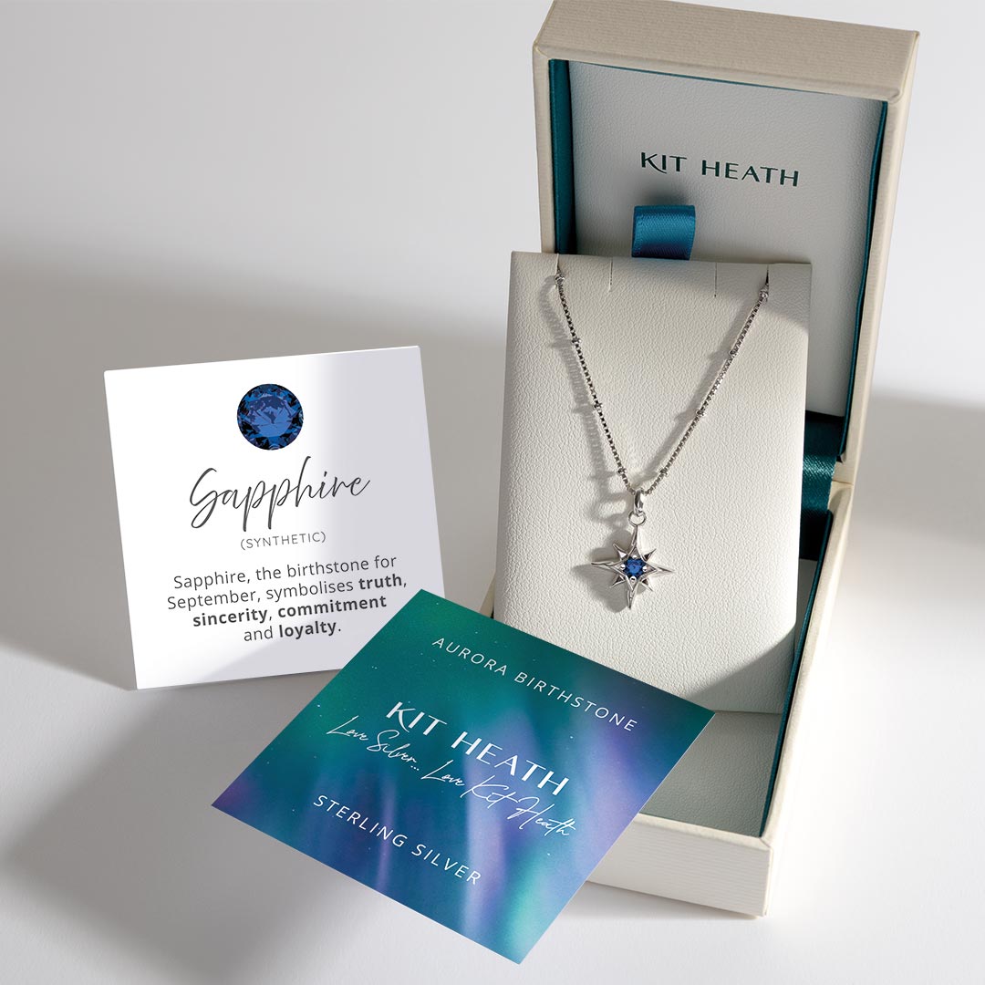 Truth, sincerity, commitment, and loyalty. Part of Kit Heath's Céleste Aurora collection, this September birthstone necklace features a stunning Sterling Silver 8-pointed star with a mini synthetic Sapphire charm suspended at the centre.