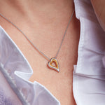 The heart pendant hangs delicately on our classic trace chain with a concealed bale, adjustable to be worn at 16 or 18 inches. Made in sterling silver, the necklace is finished in easy to maintain rhodium plate and 18ct gold plate.