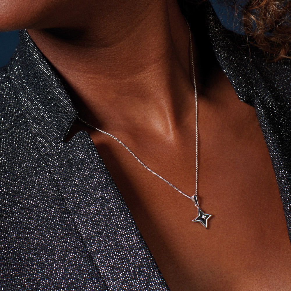 Inlaid with onyx and adorned with a miniature cubic zirconia star, the star is reversible with a high polished chamfered finish on its back. This unique design is part of our Special Edition capsule collection launched exclusively for this season.