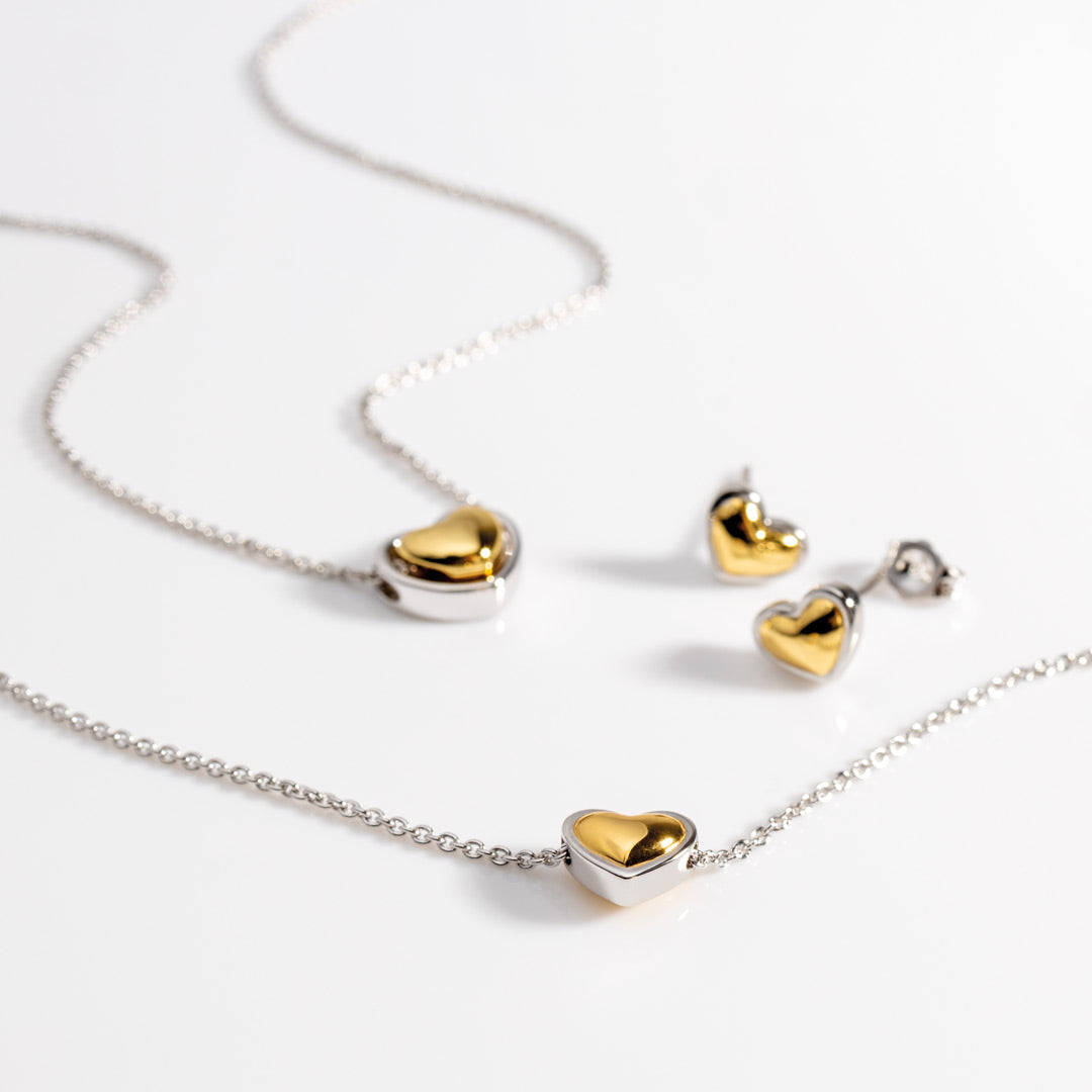 Perfect for telling someone special how much they mean to you, the curved mini heart glows in an 18ct Gold Plate Finish, cradled by the separate sterling silver pendant outline. This graceful Heart of Gold necklace is a timeless piece that will be cherished by anyone who wears it.