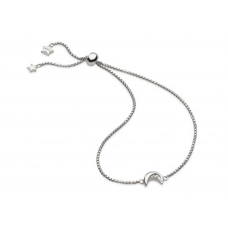 To the moon and back… A quaint crescent moon sits on this sterling silver bracelet chain, accented by a slice of pave cubic zirconia stones. Celebrating Life and Creativity, this bracelet is a little token to be adored, fastened by a tactile sliding toggle clasp.