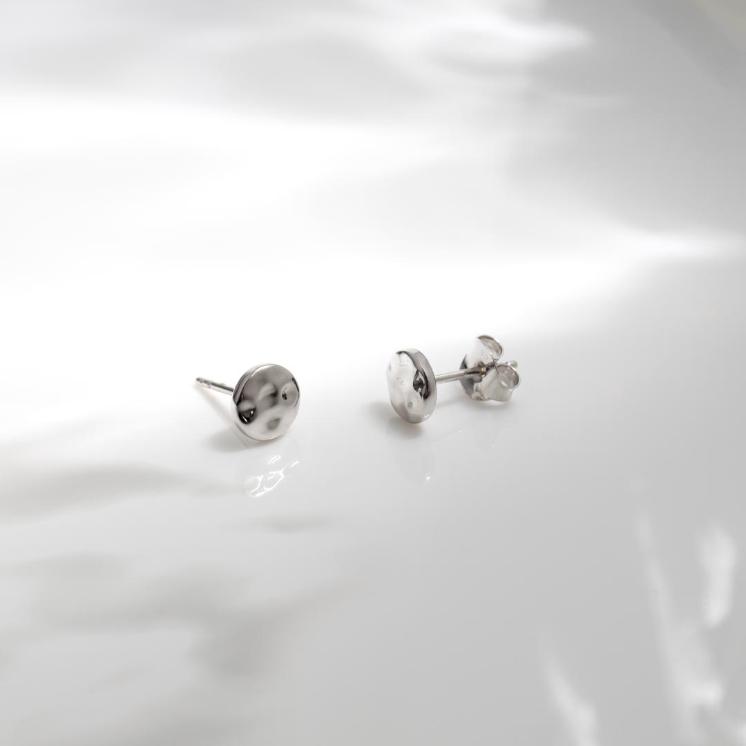 Crafted in Sterling Silver, their softly rounded, dappled discs catch the light and add subtle texture and depth.